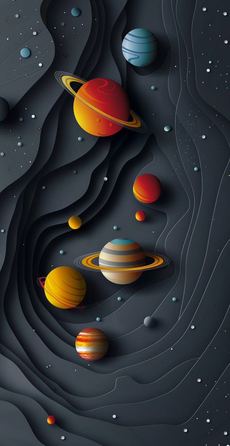 Un fondo gris oscuro con los planetas de nuestro sistema solar representados en un estilo de papel cortado. Saturno está centrado y tiene sus anillos completamente visibles, mientras que los otros planetas son pequeños y coloridos, dispuestos a su alrededor en diferentes niveles para formar un borde exterior. Este diseño crea profundidad utilizando capas de papel negro ligeramente superpuestas para las sombras. Podría utilizarse como un cartel o papel tapiz, añadiendo diversión y curiosidad sobre la exploración espacial a la decoración de su hogar en el estilo de recortes de papel.