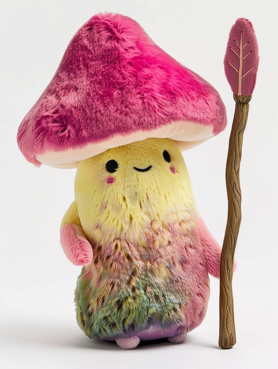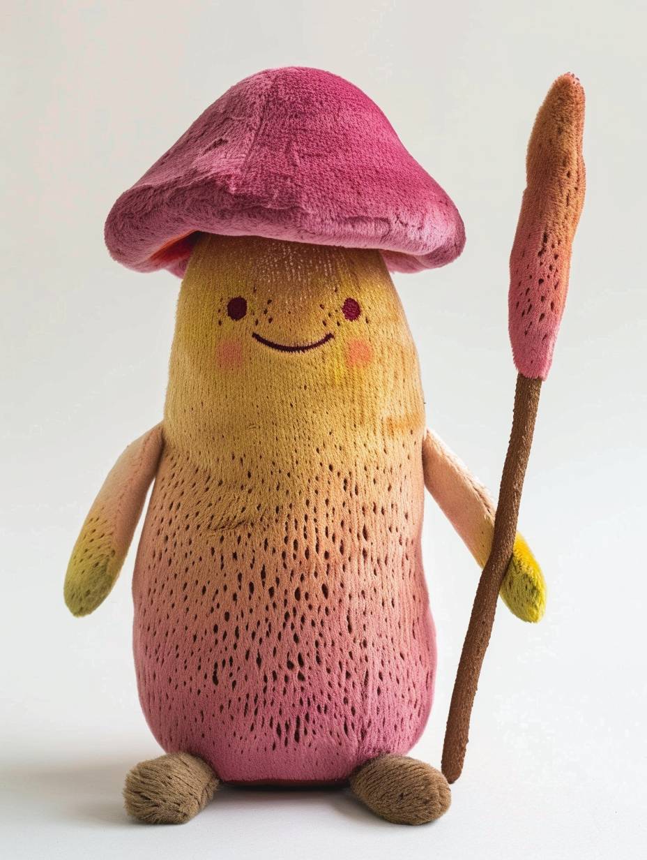 The Boletus luridus plush doll features the image of a middle-aged nationalist with a slightly wizardly demeanor. The dark pink flat and wide half dome is topped with a large cap, and the stalks fade from dark pink to greenish yellow from the root. No unnecessary decorations, super minimalist design. Holds a staff made of plush material. Plush texture. White background.8k.HD. --ar 3:4 --v 6.0