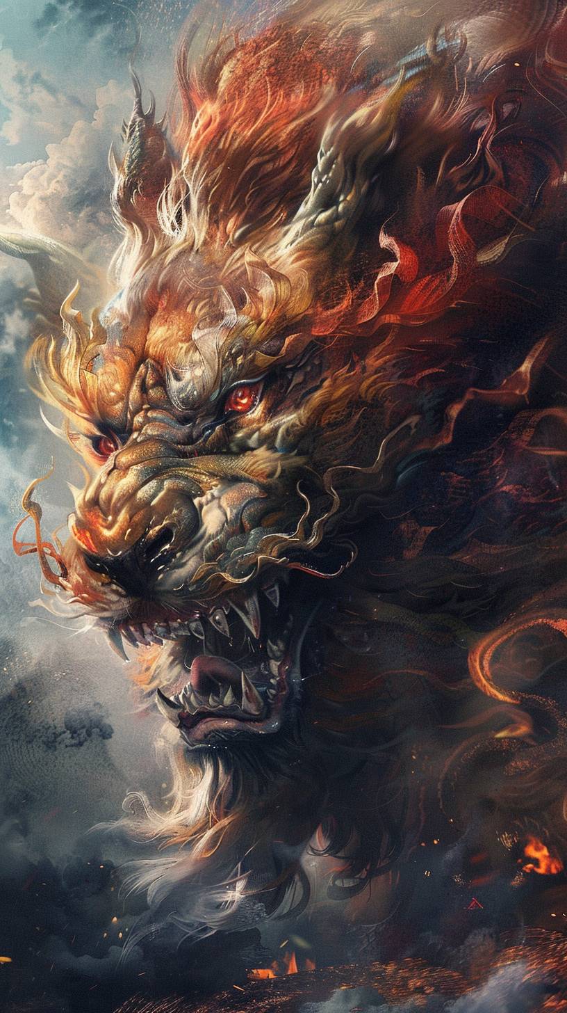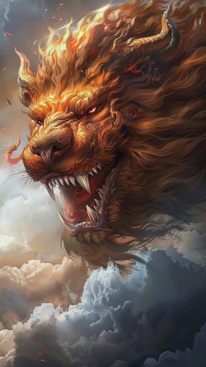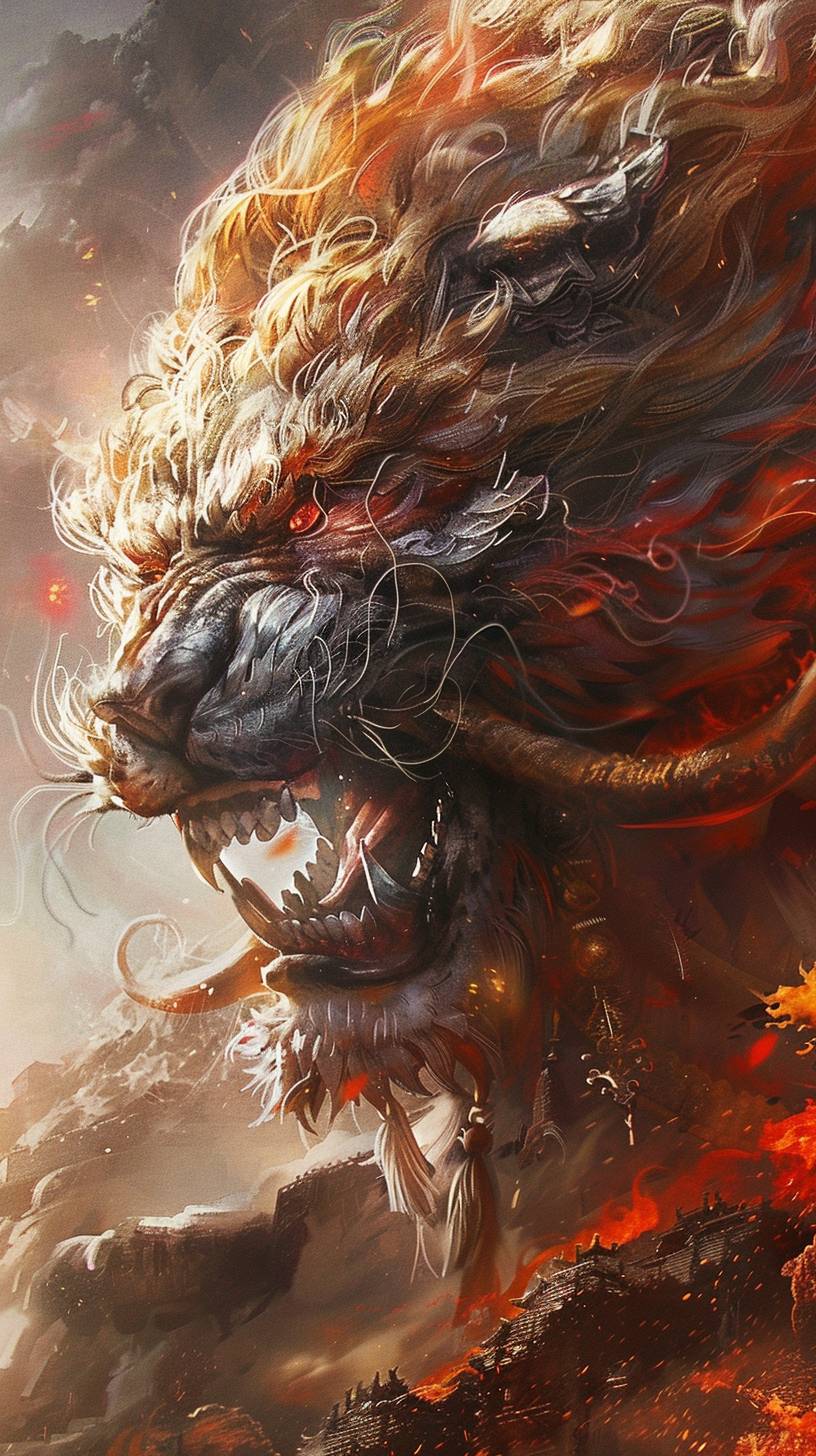 The Lion Demon King in the ancient Chinese novel Journey to the West. Whole body, a large, fierce and abnormal lion. His teeth are sharp as chisels, his head is wide, his voice is like thunder, and his eyes are sharp as electricity. His nose was facing the sky, and his eyebrows were red as flames. His appearance makes the hearts of the beasts tremble, the demons are daunted, super perfect details, super clear --ar 9:16 --v 6.0