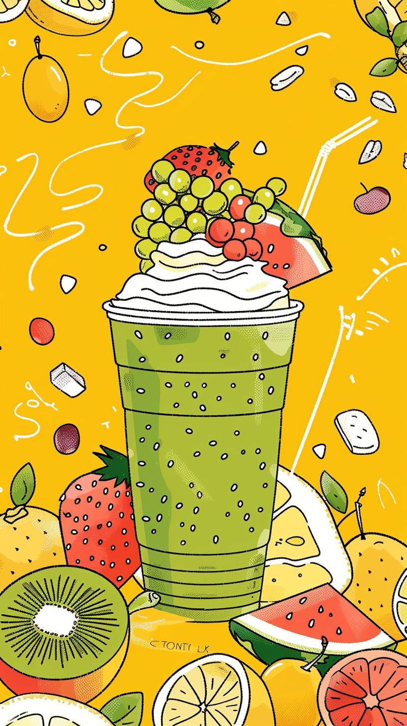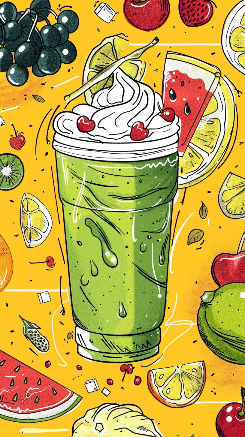 Un dibujo infantil de un batido verde con uvas y rodajas de sandía en la parte superior, en un vaso de papel con crema en la parte inferior, rodeado de ilustraciones de frutas como fresas, naranjas, limones, cerezas, limas, semillas de melón y limonada. El fondo es de un color amarillo brillante, creando una atmósfera general de alegría. En algunos lugares puede haber líneas blancas o garabatos para representar elementos como cubitos de hielo o una escala de barra.