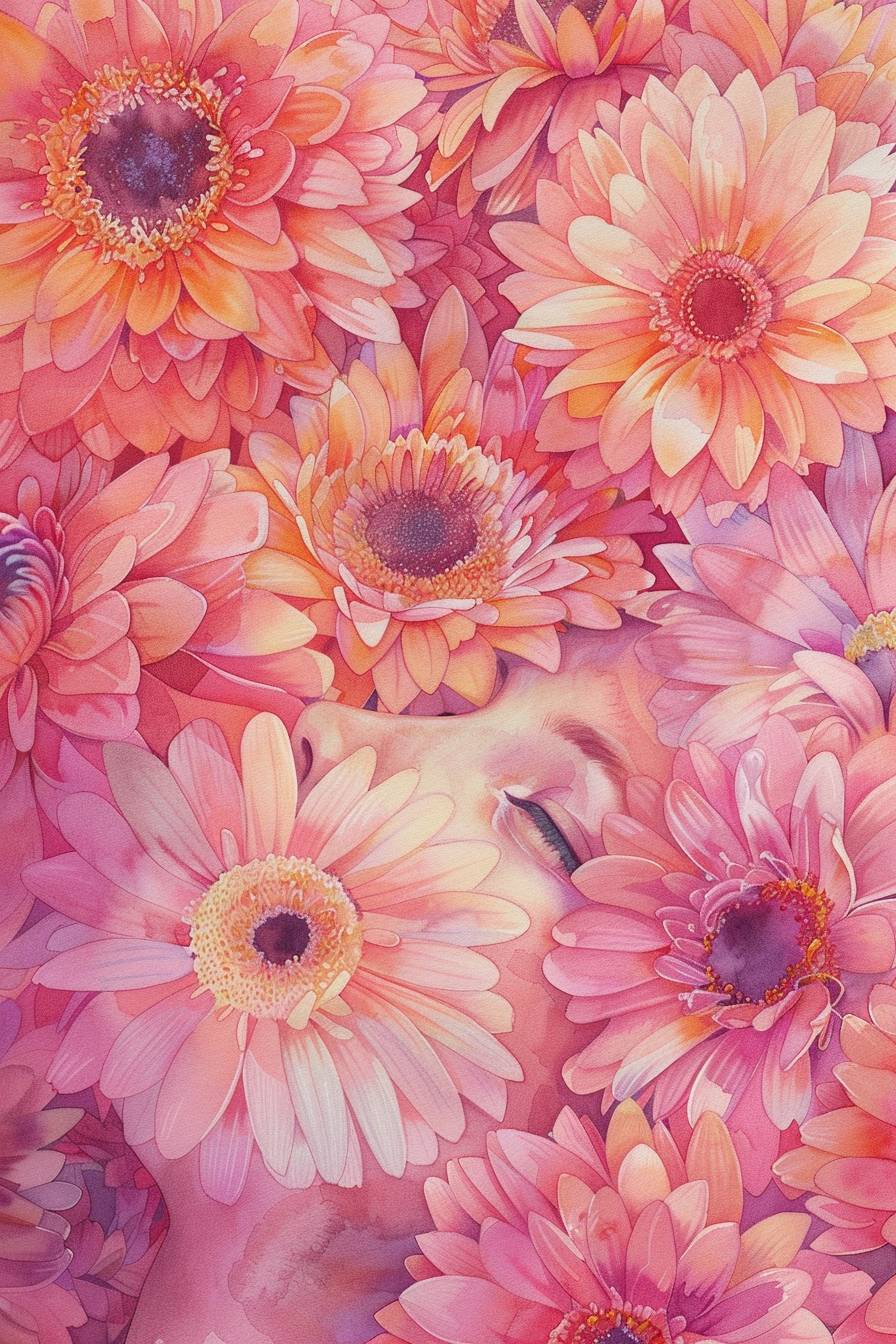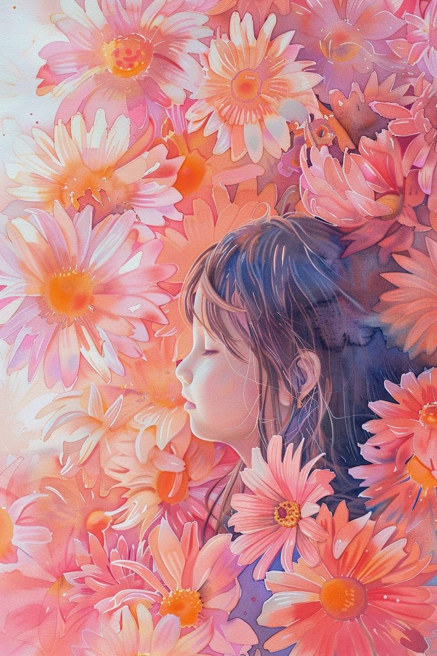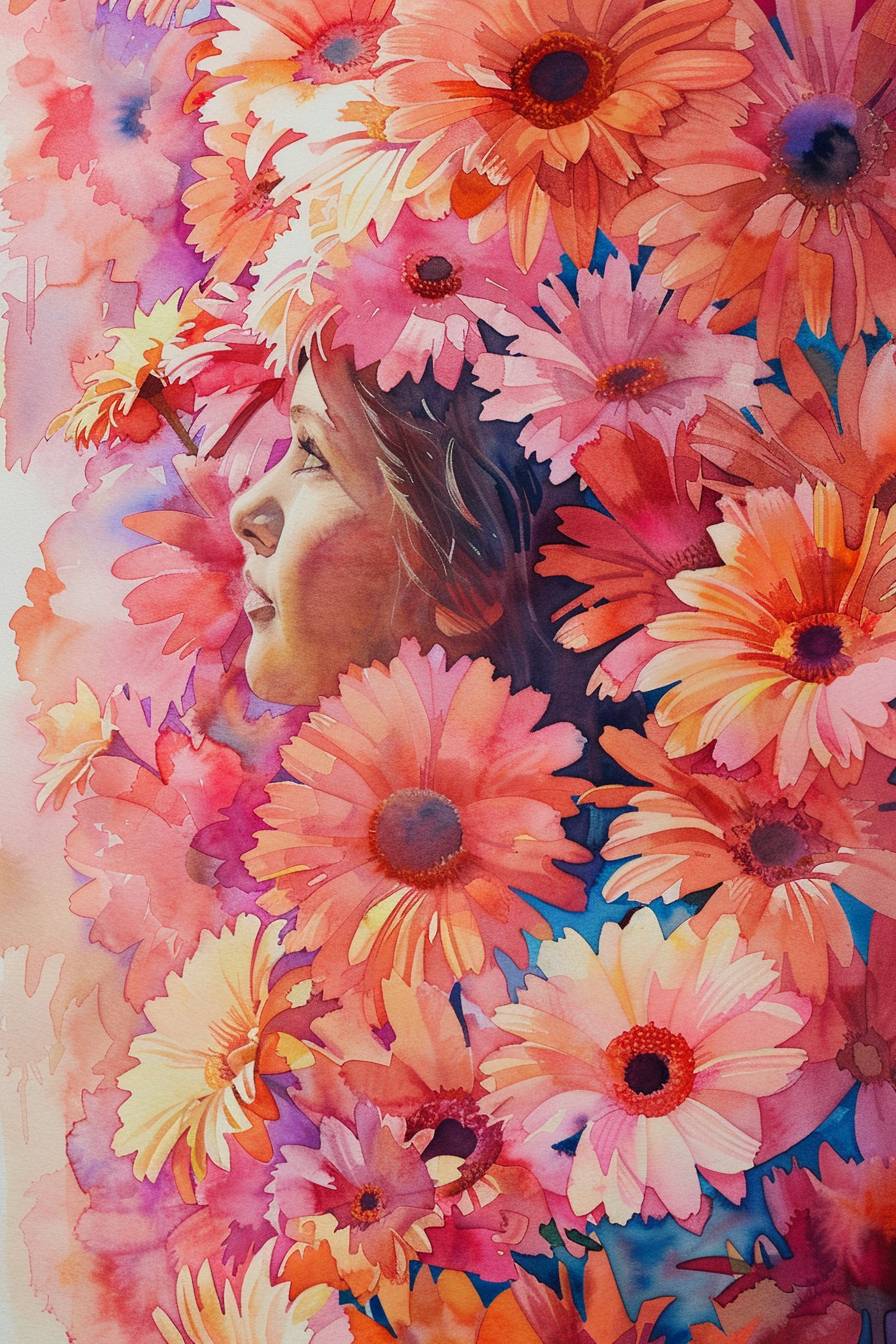 Watercolor portrait of a girl's side back amidst in pink and orange african daisy, soft focus on her face and upper body, surrounded by a sea of pink and orange african daisy, ethereal mood, flowers blooming like a piece of brocade. --ar 2:3 --v 6.0
