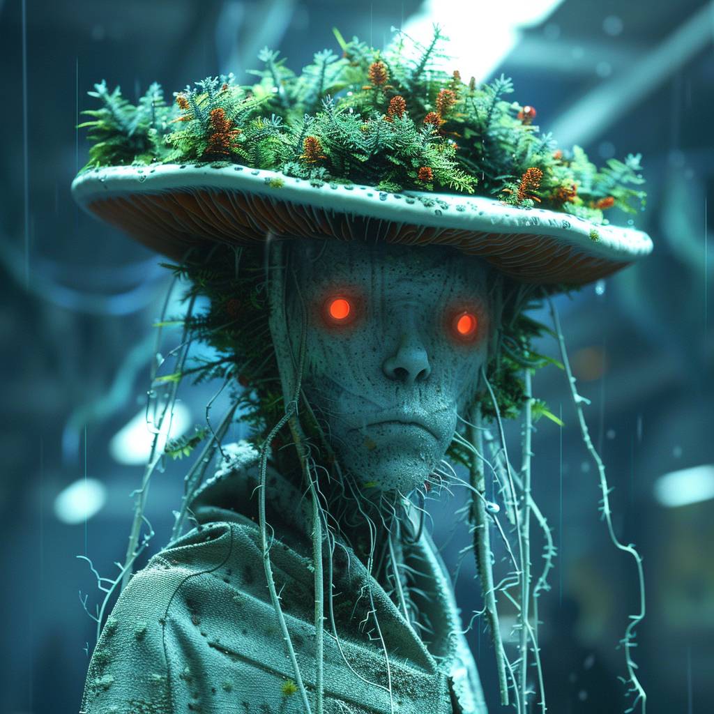 Elfo de hongo conífero con enorme tocado y abrigo conífero en verde ácido y rojo.