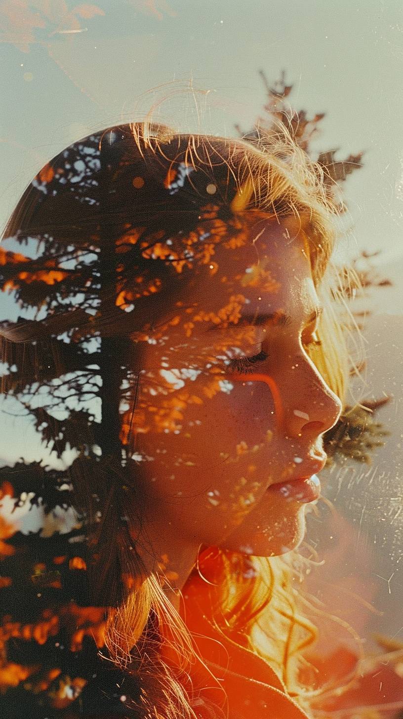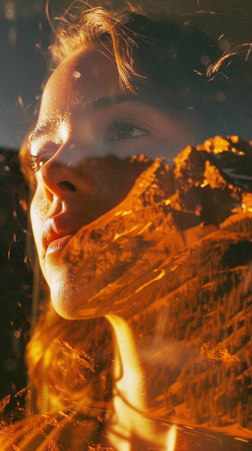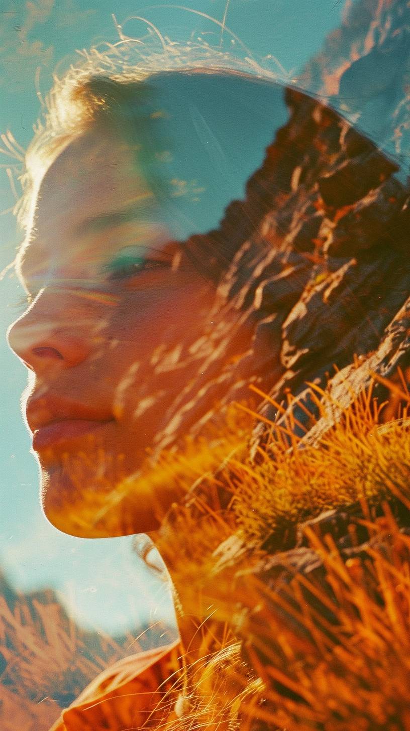 beautiful woman in sunlight mountain, dark orange and light orange, double exposure, dark reflections, lomography, color negative --ar 9:16 --v 6.0