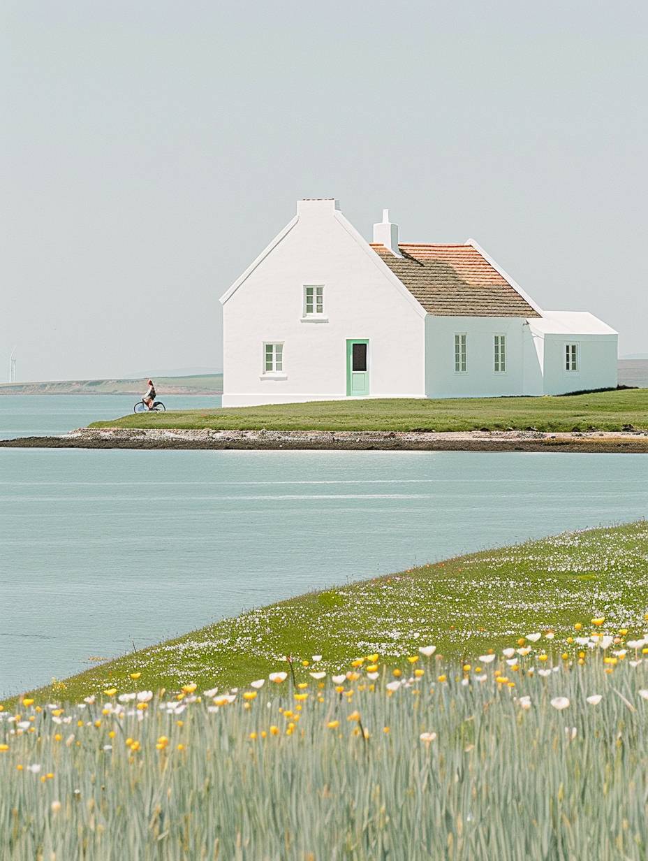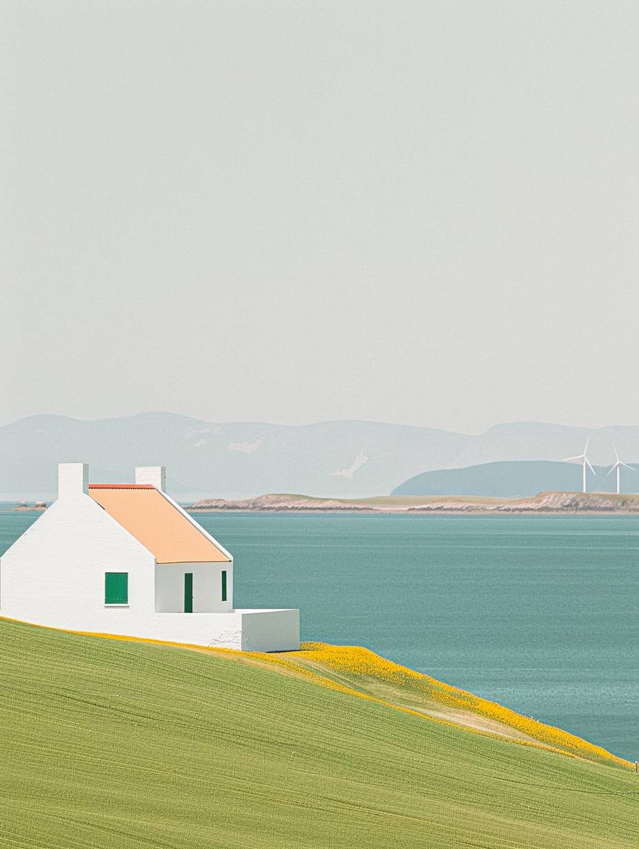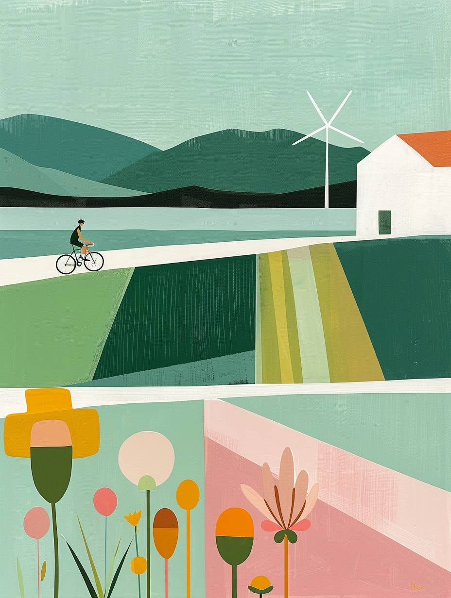 A picturesque countryside Bright blue sky Green hills and grasslands A quiet lake Wind power generator Yellow Flower Sea Small house (white wall and red roof) Cyclists Fresh blue sky Green grasslands and hills Bright yellow flowers A peaceful and peaceful atmosphere Minimalism Warm color tones A calm and relaxed scene The theme of nature and environmental protection --ar 3:4 --sref 2874126711 --personalize p76lvri --stylize 250 --v 6.0
