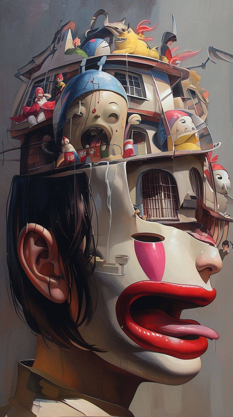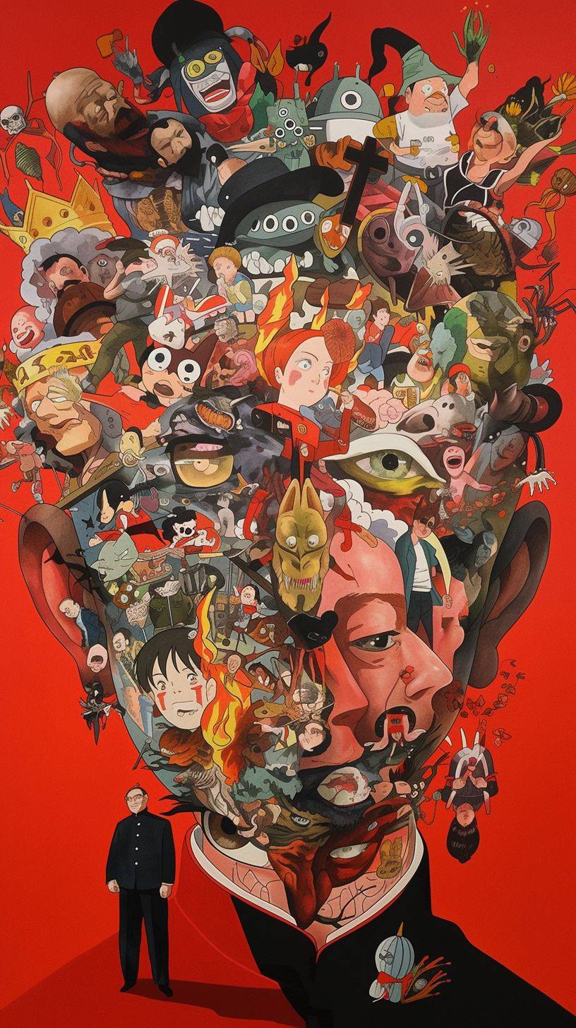 Una cabeza enorme adornada con personajes de Studio Ghibli, que combina estilos fantásticos y macabros con colores vibrantes y detalles realistas.