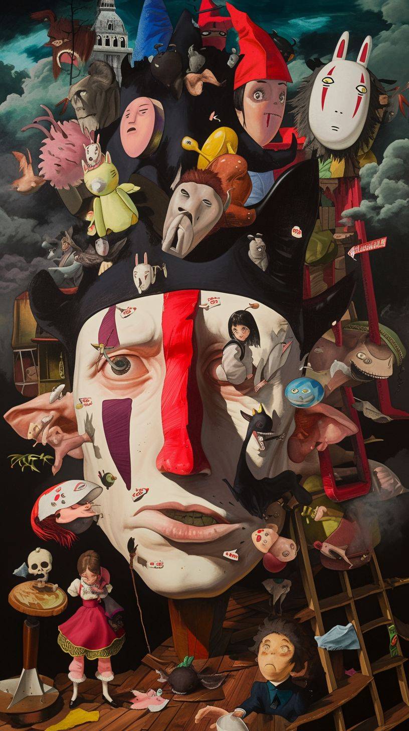 anime painting of a huge head with Studio Ghibli characters on it, in the style of Grégoire guillemin, junji Ito, Hieronymus Bosch, playful yet macabre, mixed media marvel, colorful biomorphic forms, comic art, McDonaldpunk, primary colors, realistic detail --ar 9:16 --niji 6 --style raw