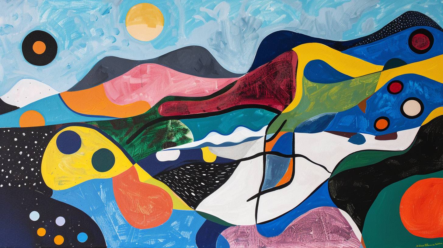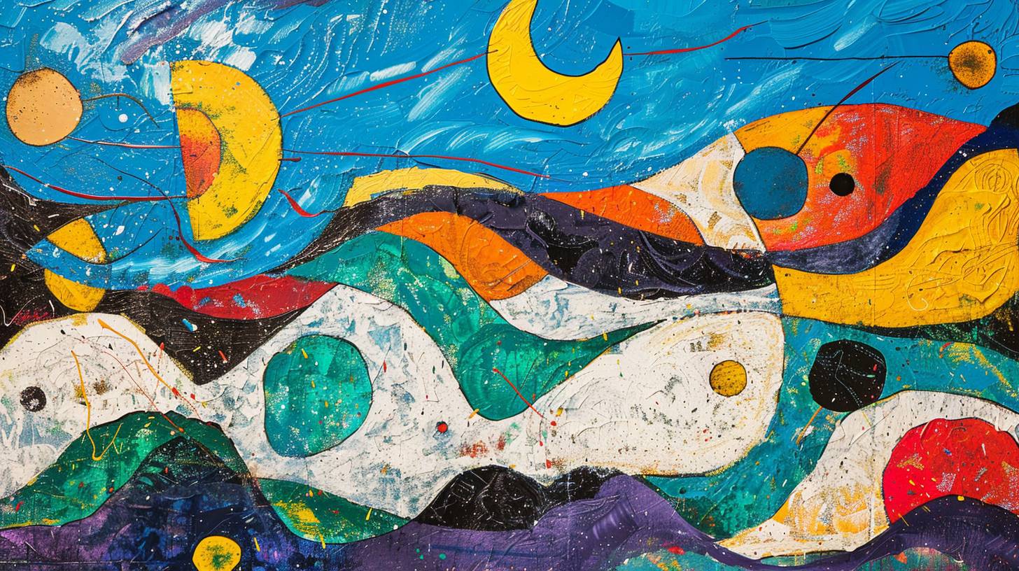 Un paisaje abstracto y surrealista de Mallorca inspirado en los estilos de Joan Miró y Joaquim Mir. La escena debe combinar elementos naturales como el mar, las montañas y los cielos con formas abstractas y colores audaces. Usa los elementos surrealistas de Miró y los colores vibrantes combinados con las pinceladas expresivas de Mir para crear una representación de la belleza de Mallorca que sea onírica pero dinámica.
