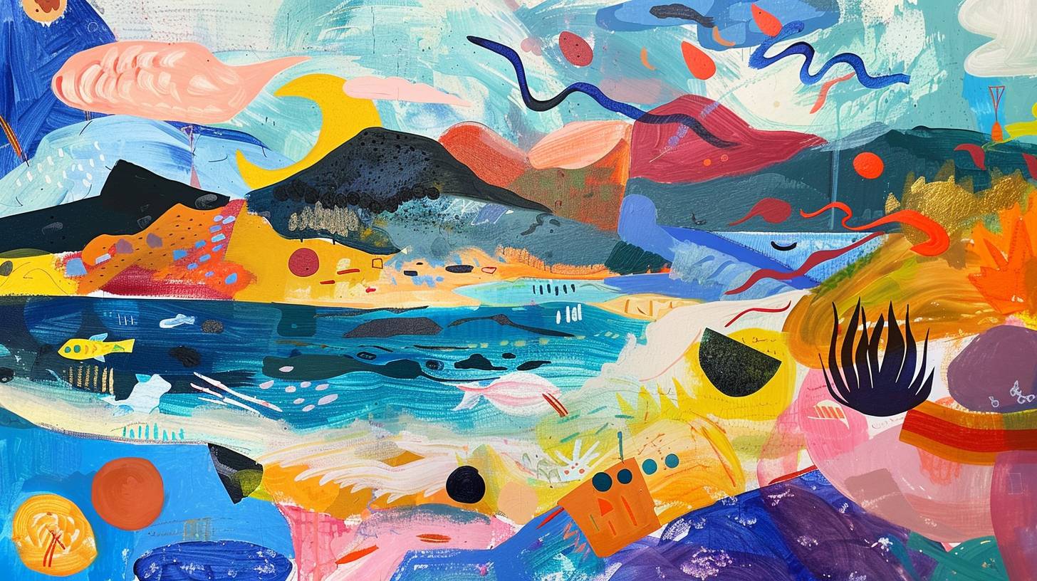 An abstract and surreal landscape of Majorca inspired by the styles of Joan Miró and Joaquim Mir. The scene should blend natural elements like the sea, mountains, and skies with abstract forms and bold colors. Use Miró’s surrealist elements and vibrant colors combined with Mir’s expressive brushstrokes to create a dreamlike yet dynamic portrayal of Majorca’s beauty --v 6.0 --ar 16:9
