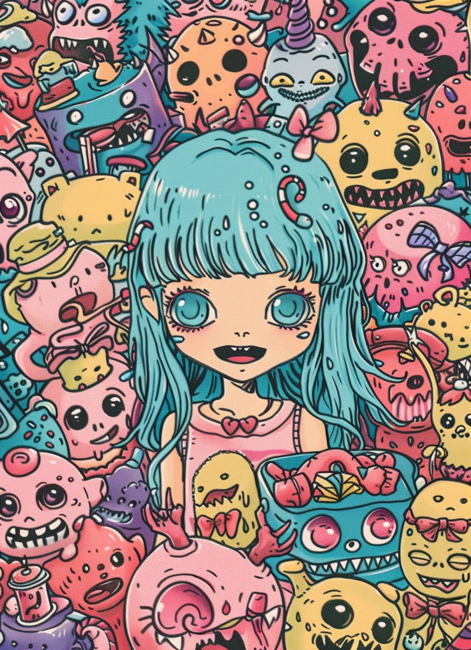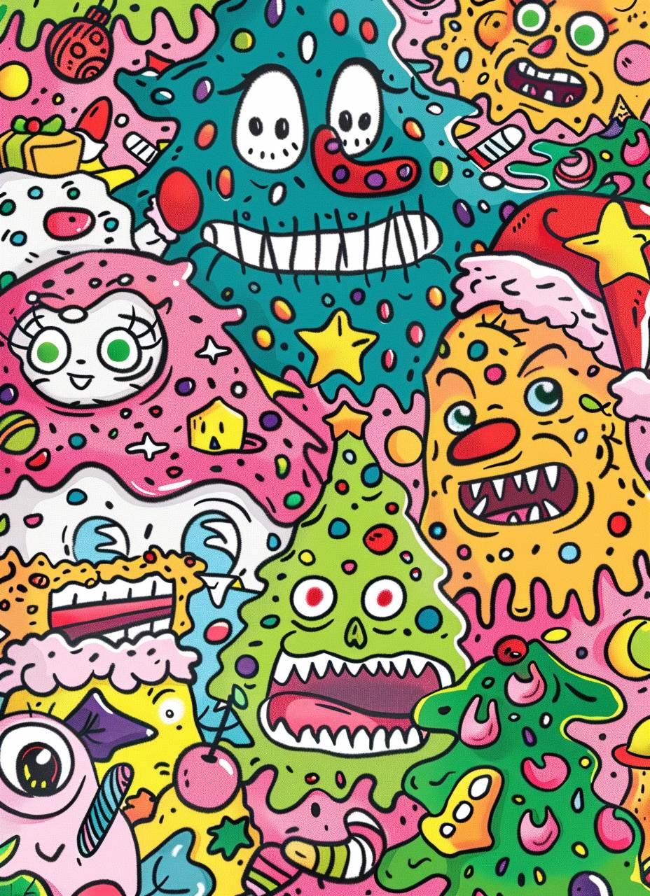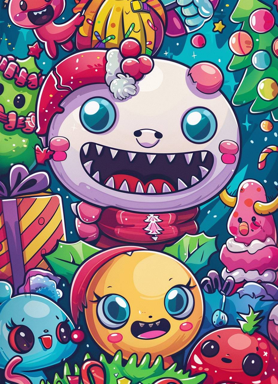 Illustrate a Kawaii Christmas, Creepy Creatures Cartoon Color cover, colorfully Background, A illustration book cover, cartoon illustration, A illustration coloring book cover , colorfully page --ar 8:11 --v 6.0