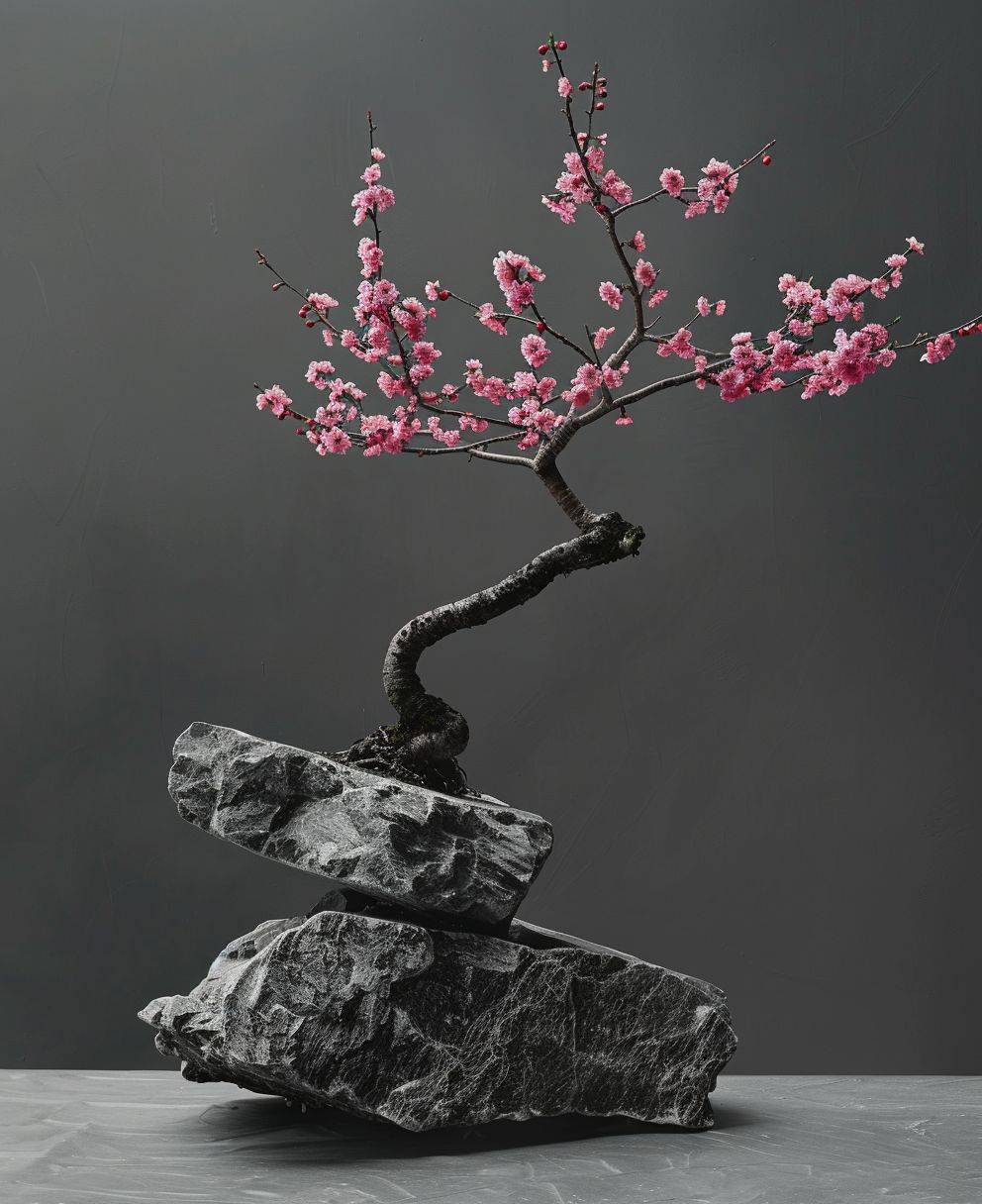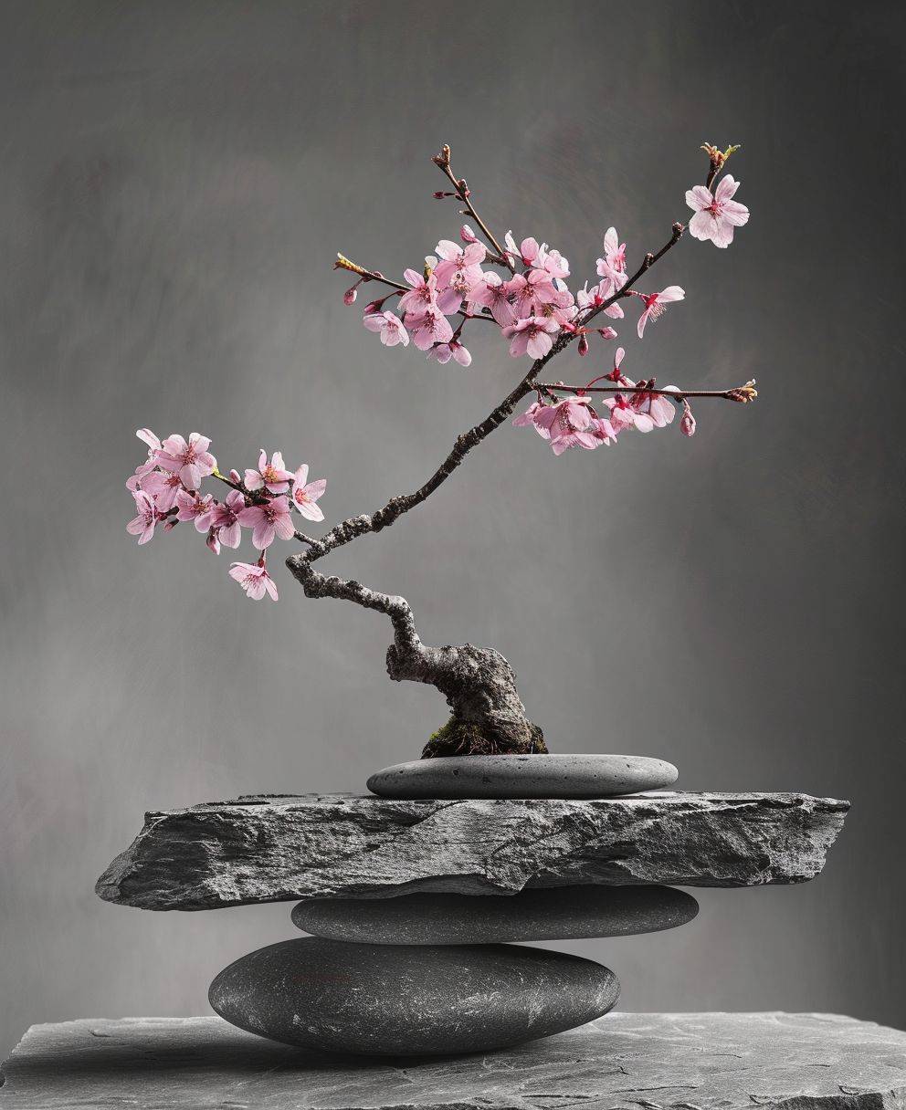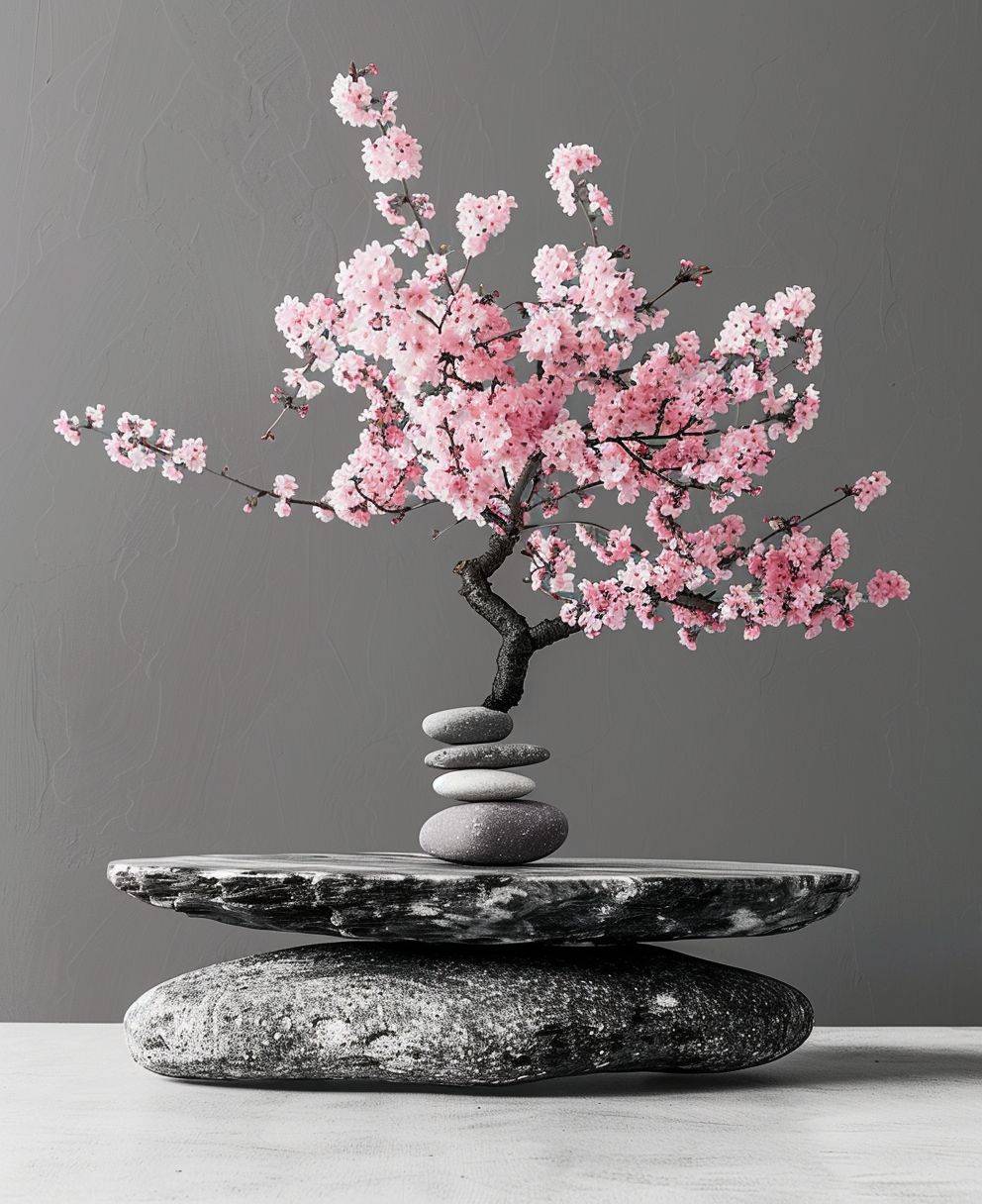hyper realistic photography, black and white photography, stones balancing on a simeteical way, with a pink cherry tree bonsai --ar 9:11