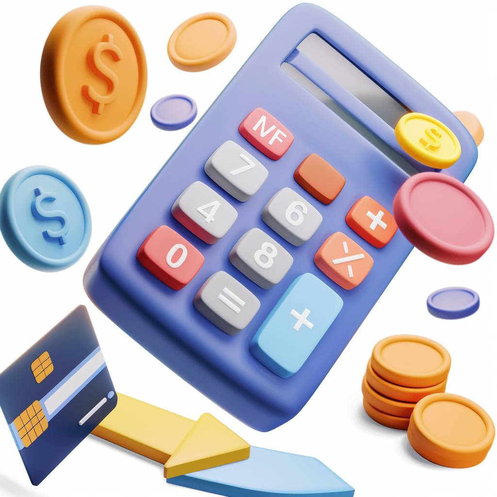 Iconos 3D de una calculadora, monedas y una tarjeta de crédito flotando en el lado derecho en un estilo de dibujo animado, con una paleta de colores azul y un fondo blanco, con una flecha amarilla apuntando a una calculadora en la esquina inferior izquierda.