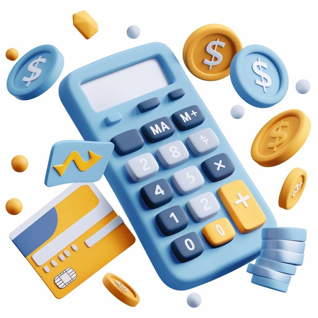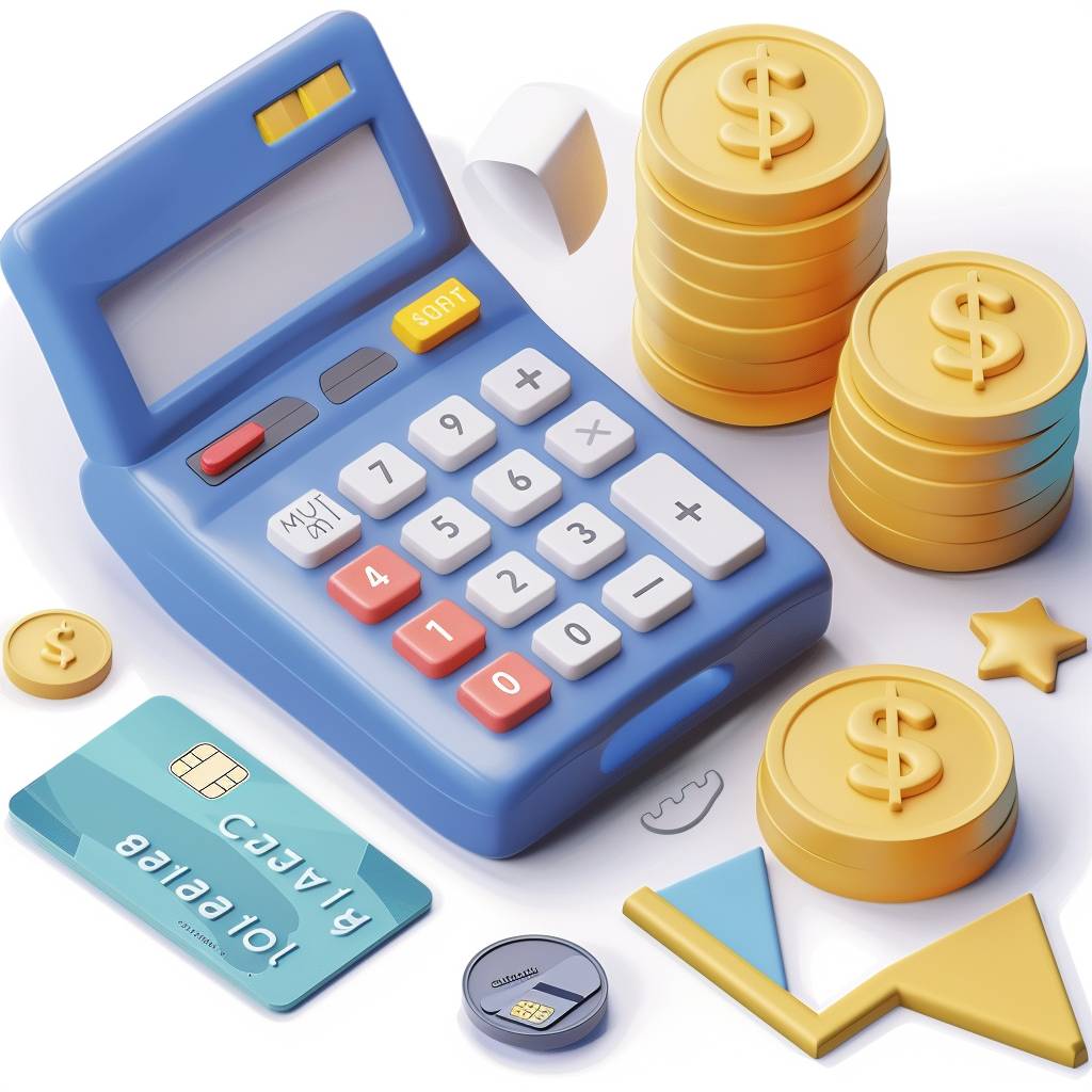 3D icons of a calculator, coins and credit card floating around the right side in the style of a cartoon, with a blue color palette and on a white background, with a yellow arrow pointing to a calculator at the bottom left corner. --v 6.0