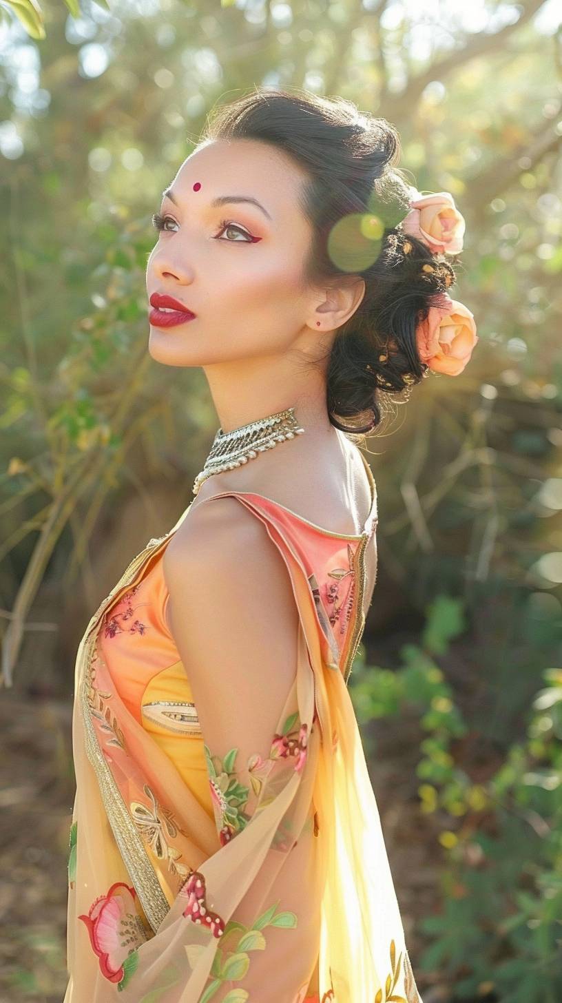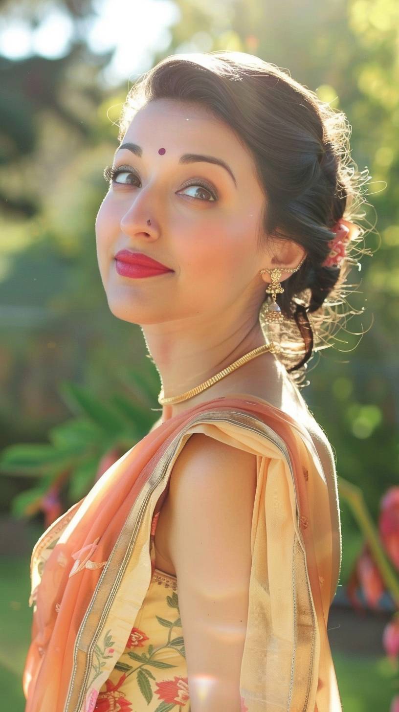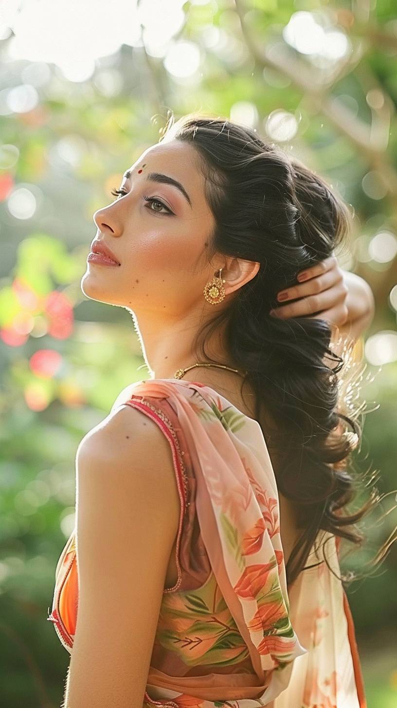 Una mujer con un saree indio tradicional mira a lo lejos.