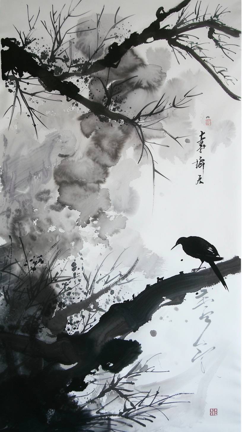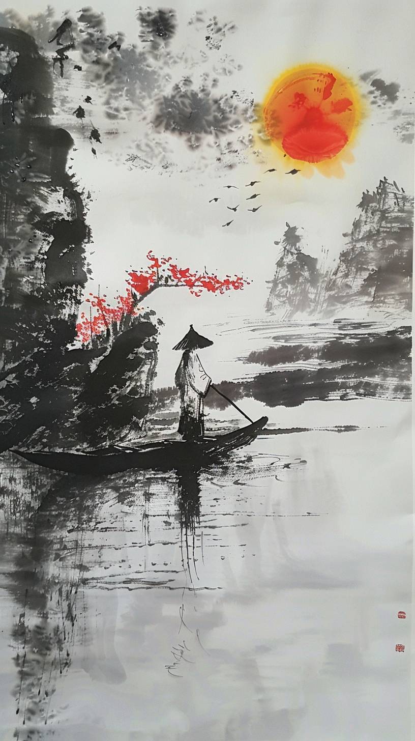 Pintura de tinta sumi, sabiendo la temporada de buenas lluvias, comienza en primavera, sigue el viento y entra en la noche, humedece las cosas y es fina y silenciosa. Las nubes sobre los campos son negras, el fuego del barco de río está solo y claro, el fuego del barco de río está solo, y al amanecer puedes ver la humedad roja del mar. Las flores no son demasiado pesadas para un castillo de brocado.
