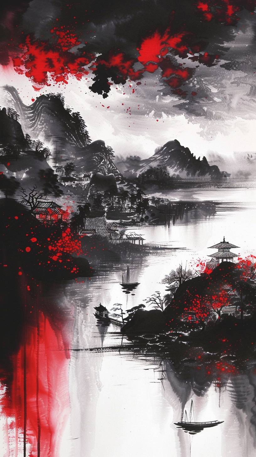 sumi ink painting,Knowing the season for good rainfall,It begins in spring,It follows the wind and enters the night,It moistens things, and is fine and voiceless,The clouds over the fields are black,The riverboat fire is alone and clear,The riverboat fire is alone, and at dawn you can see the red dampness of the sea,The flowers are not too heavy for a brocade castle, --ar 9:16 --v 6.0