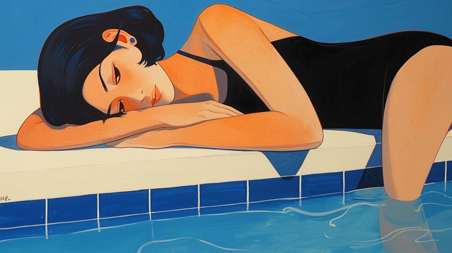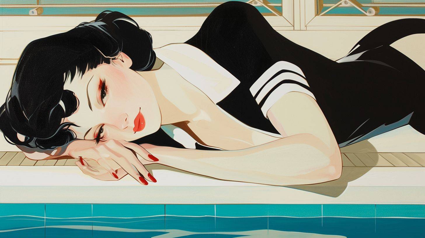 Una pintura de una niña acostada junto a la piscina, que refleja el glamour del arte deco, el estilo de Patrick Nagel y retratos influenciados por el pop art, mostrando una serenidad contenida y líneas de manga audaces.