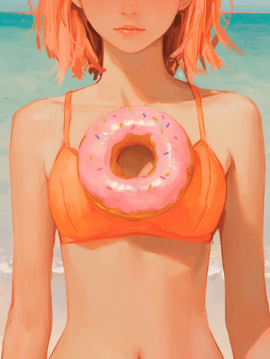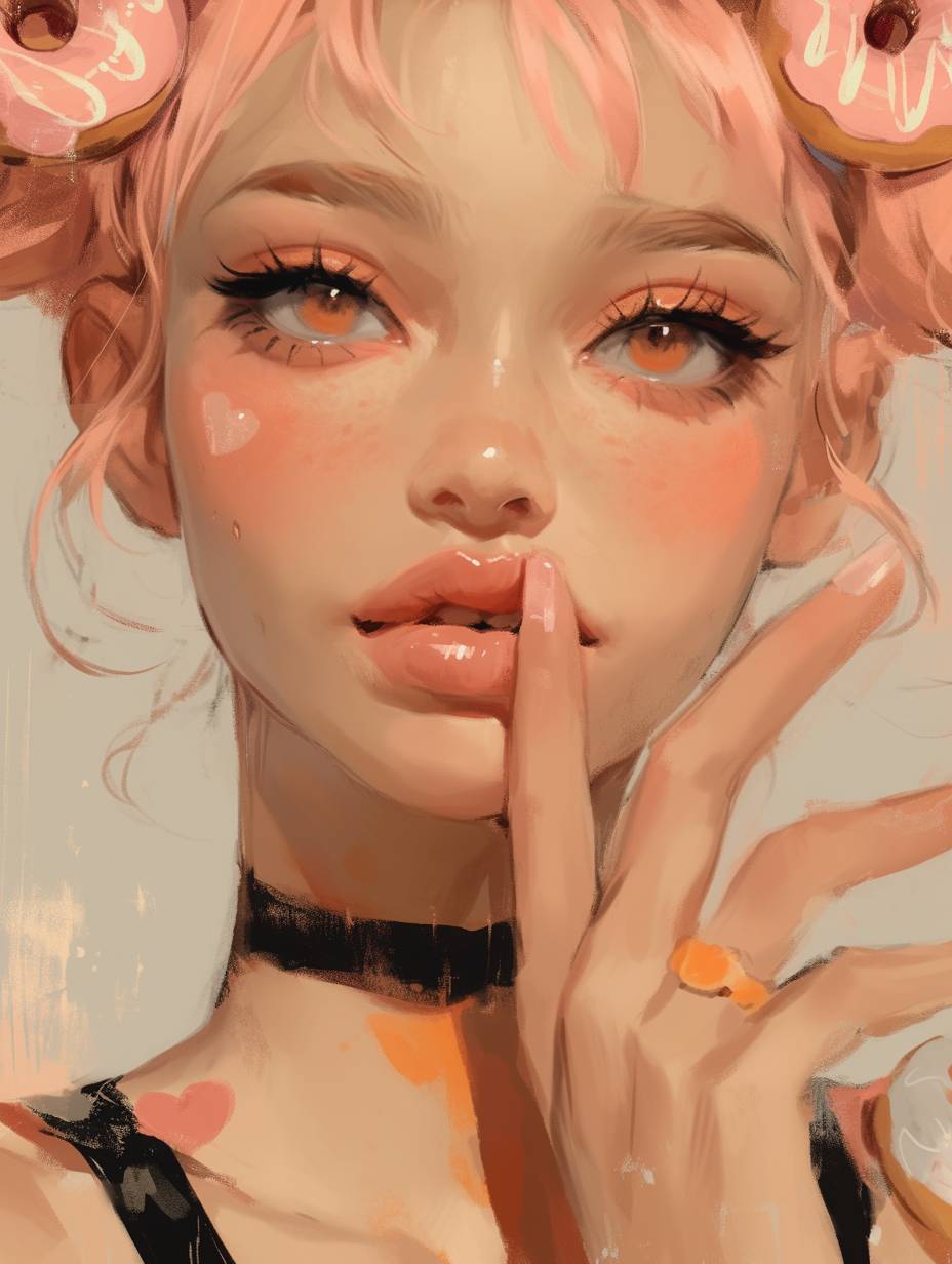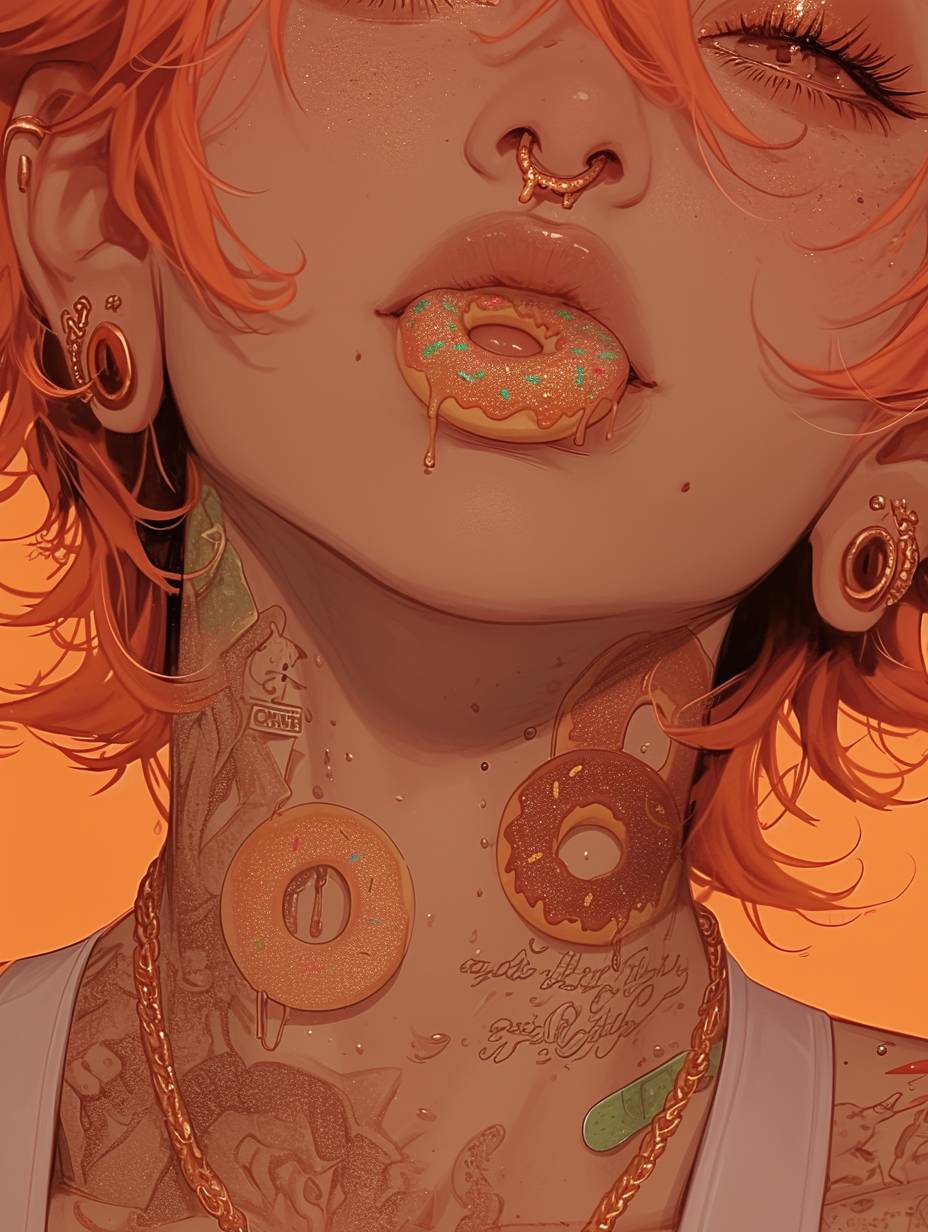 Dunkin Donuts themed woman, orange and pink tattoos, donuts, light orange and light pink and bronze, realistic manga --s 1000 --niji 6 --style raw --ar 3:4