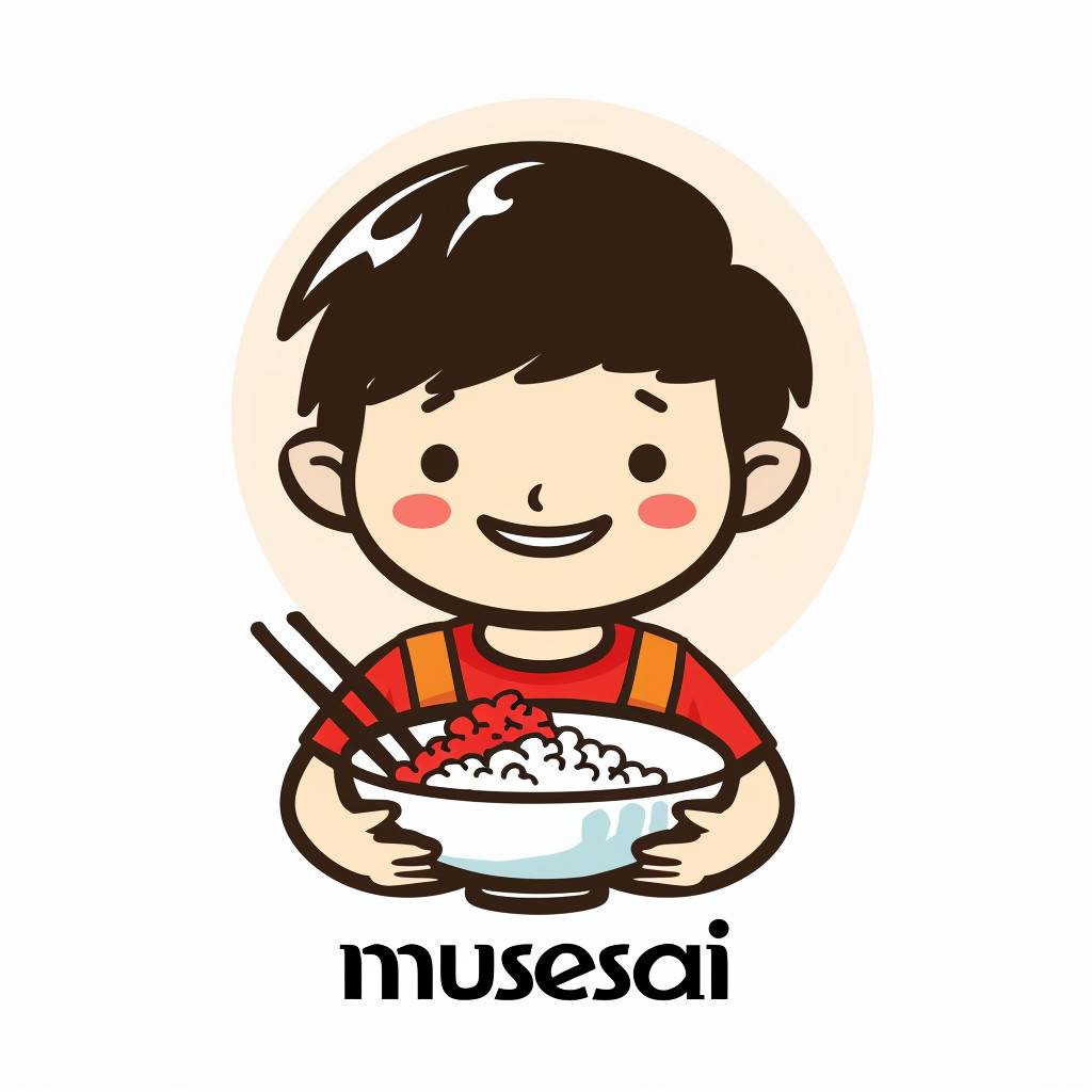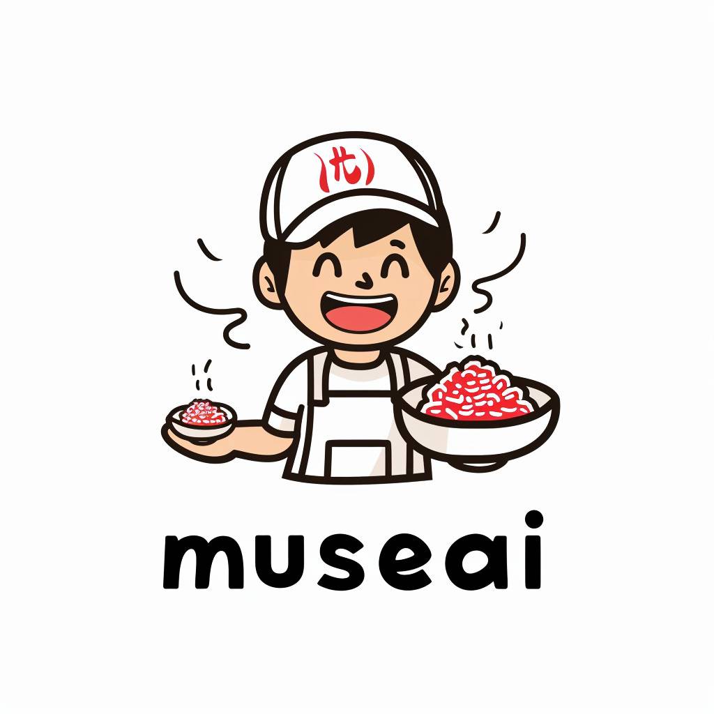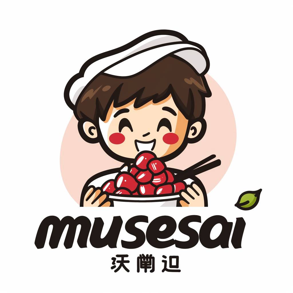 Un diseño de logo de estilo caricaturesco y lindo para 'musesai', que presenta a un niño asiático sosteniendo un tazón de polvo rojo agridulce, con el nombre de la marca escrito en texto negro debajo. El fondo es blanco, con líneas simples y colores planos, creando una atmósfera relajada. El diseño está en estilo de caricatura.