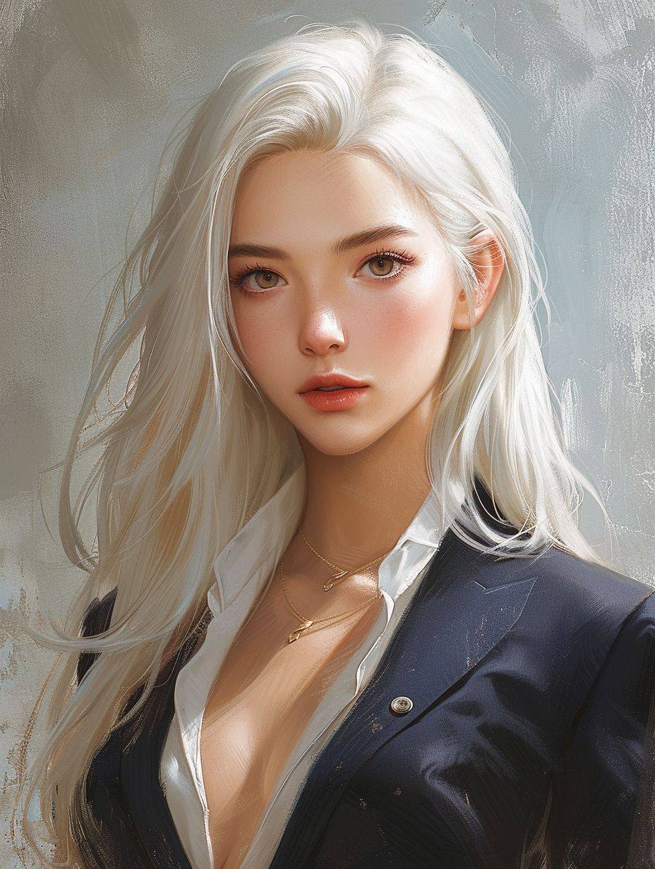 1girl,beautiful chinese girl, Comb-over hair,white hair,ultra-detailed, highres, extremely detailed,teenage,platinum blonde hair,upper body,correct facial features,suit,digital painting,album cover,illustration --style raw --ar 3:4 --v 6 --stylize 250