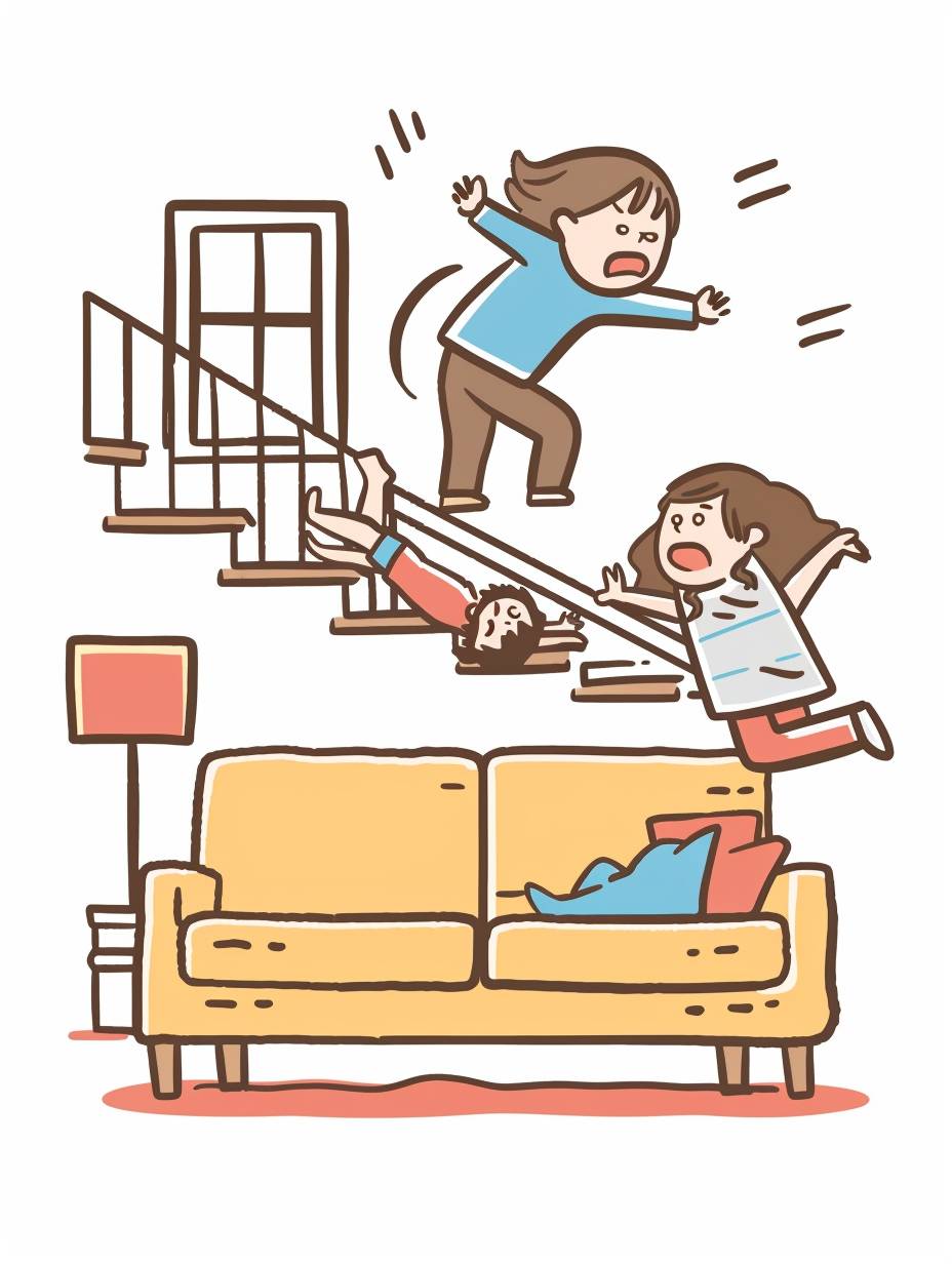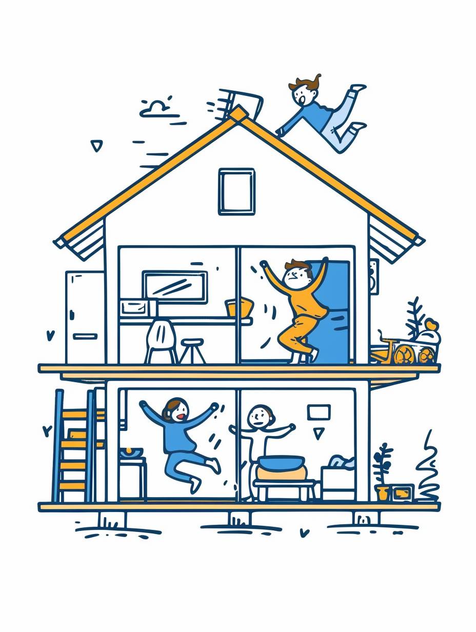 Someone living on the second floor is jumping on the floor and making noise. The people living on the first floor are annoyed by the noise and look angry.white background.Minimalistc.Bold line graphic logo of a cute cartoon,line art,Clean line style,Low Saturation ,flat illustration,commercial imagery --ar 3:4 --v 6.0