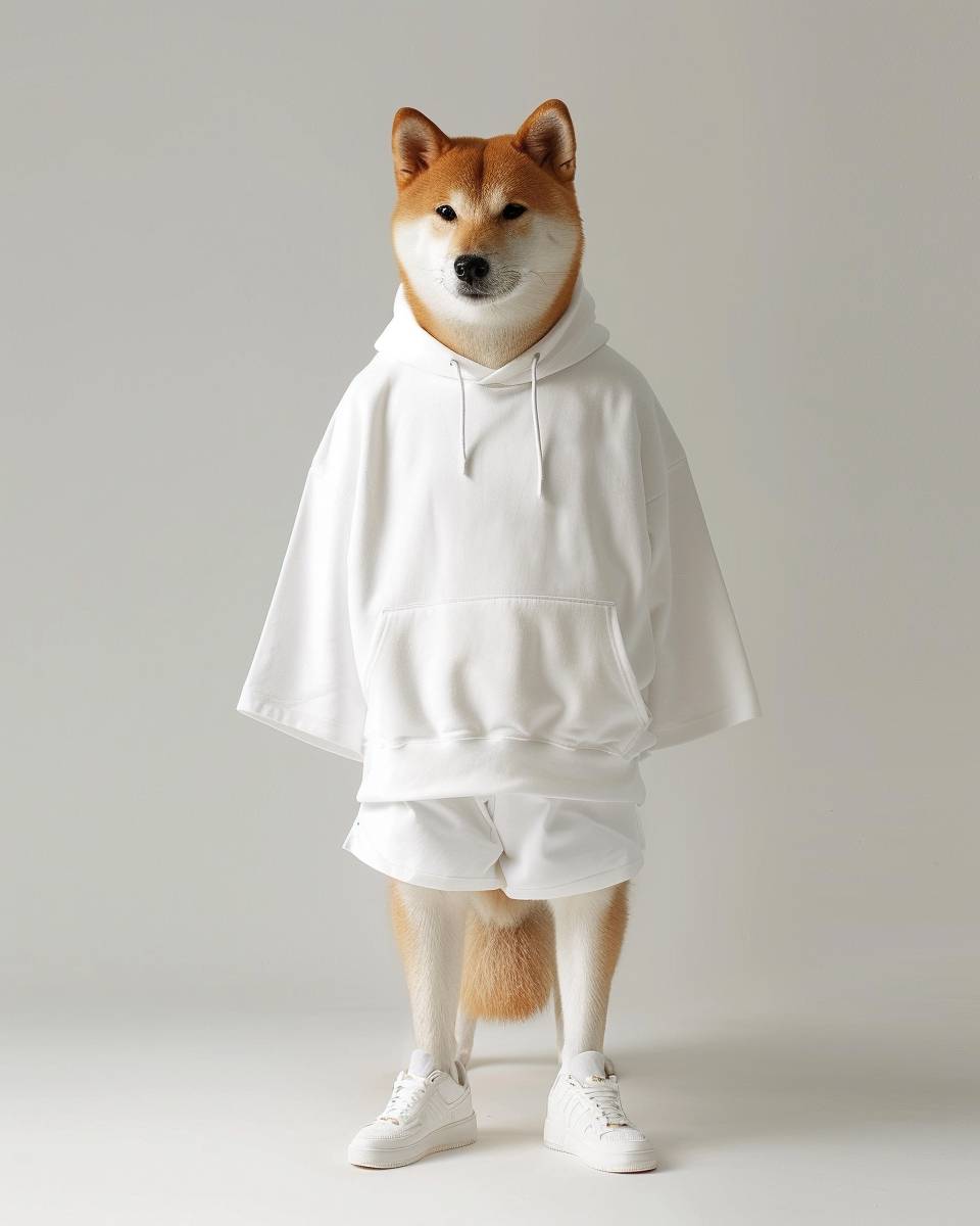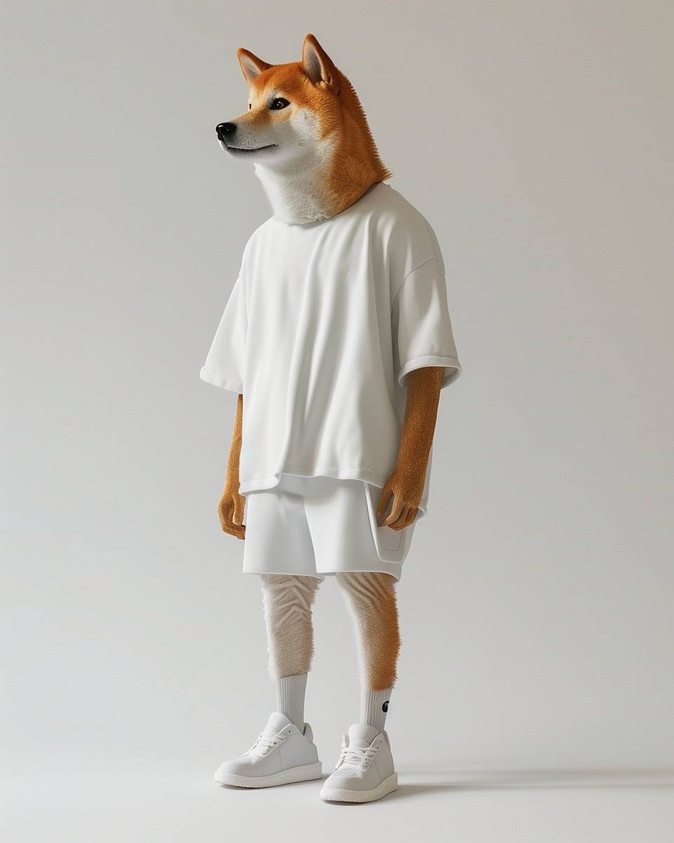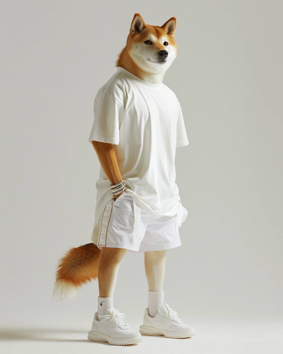 Un conjunto de fotos de cuerpo completo muy detallado y realista de un Shiba Inu alto, delgado y atlético con una camiseta blanca de gran tamaño, pantalones cortos blancos y zapatos blancos cortos. El Shiba Inu tiene un cuerpo largo, como de modelo de moda, con pelaje en los brazos y las piernas que coincide con el color y el patrón de la cabeza del Shiba Inu. Los pantalones cortos y la camiseta están bien planchados. El fondo es blanco liso, y las fotos se toman en un estudio con iluminación de moda al estilo de la marca COS. Fotos de cuerpo completo en una variedad de poses.