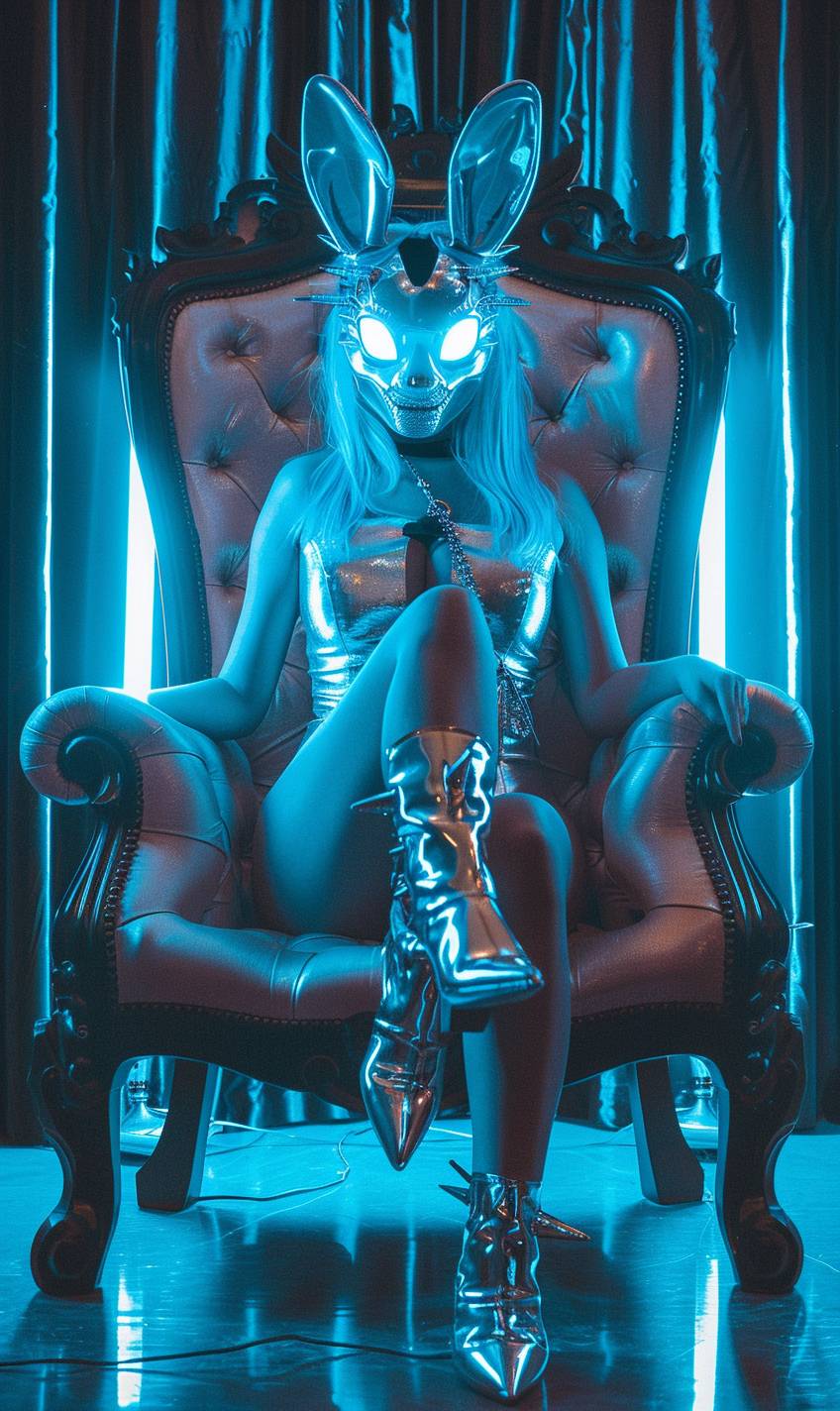 Fondo de color en contraste degradado, retrato de cuerpo entero, toma de ángulo amplio, mujer, ojos que brillan en neón, vistiendo [azul claro, blanco, cromo], [cuero brillante], [collar con largos picos de cromo brillante], [máscara de conejo], tacones altos puntiagudos, sentada en un espléndido trono real malvado con estilo gótico retorcido, en una habitación vacía.