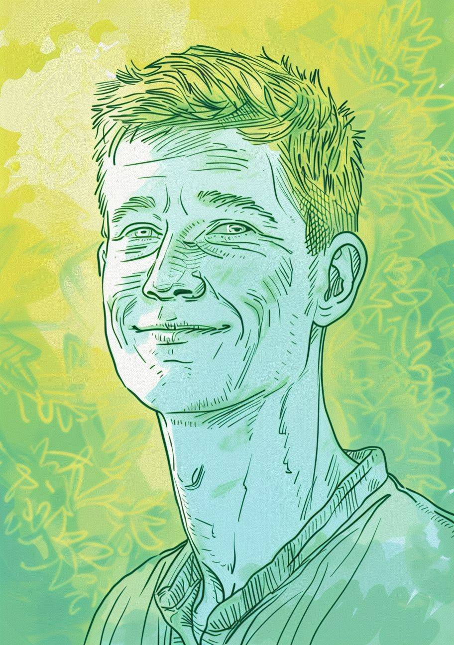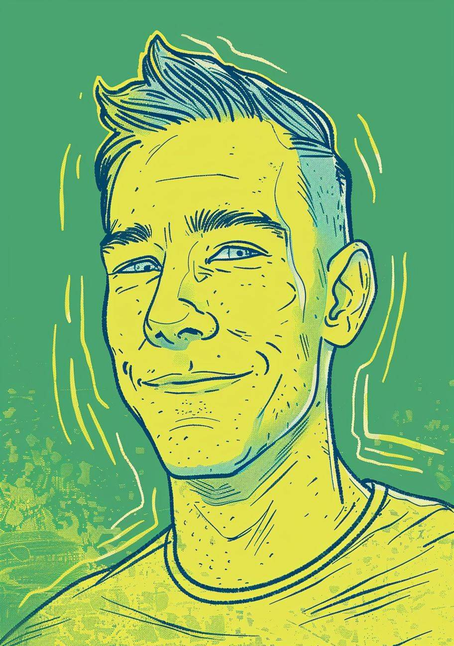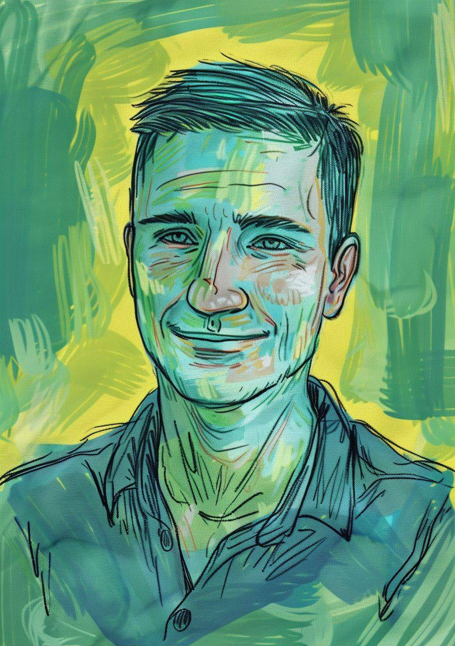 A drawing of an average man in his thirties with short hair, looking straight ahead and smiling slightly. The background is green with yellow highlights. Use the colors teal blue and lime green for coloring. In the style of children's book illustration. --ar 45:64 --stylize 50