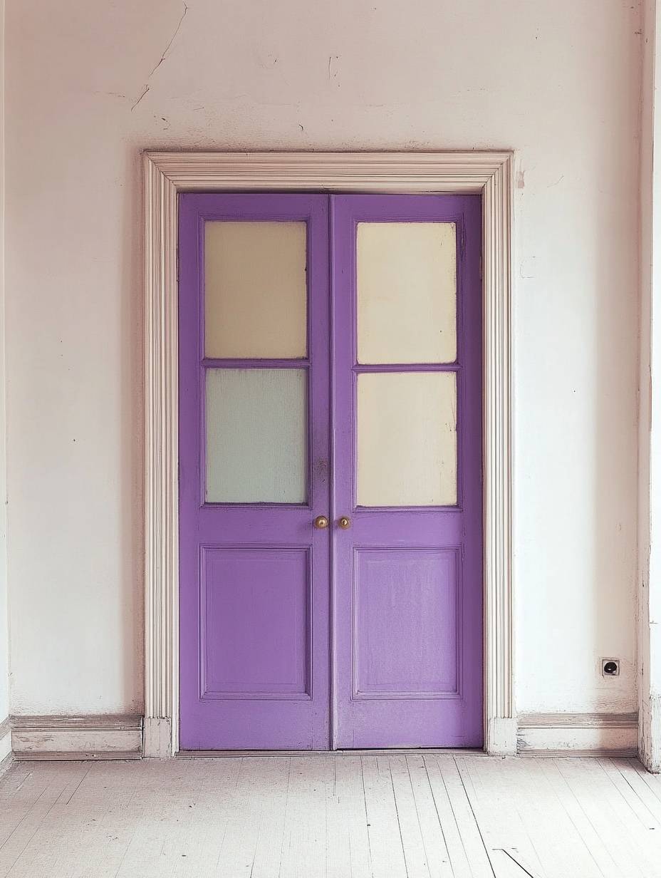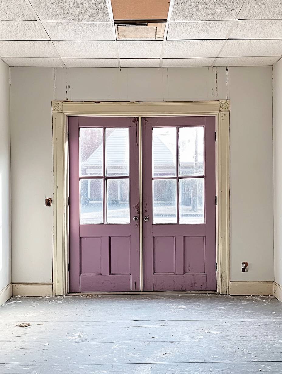 A photo of purple double doors with frosted glass in the middle, in an empty room being painted white in the style of an empty room being painted white. --ar 3:4 --iw 2 --v 6.1