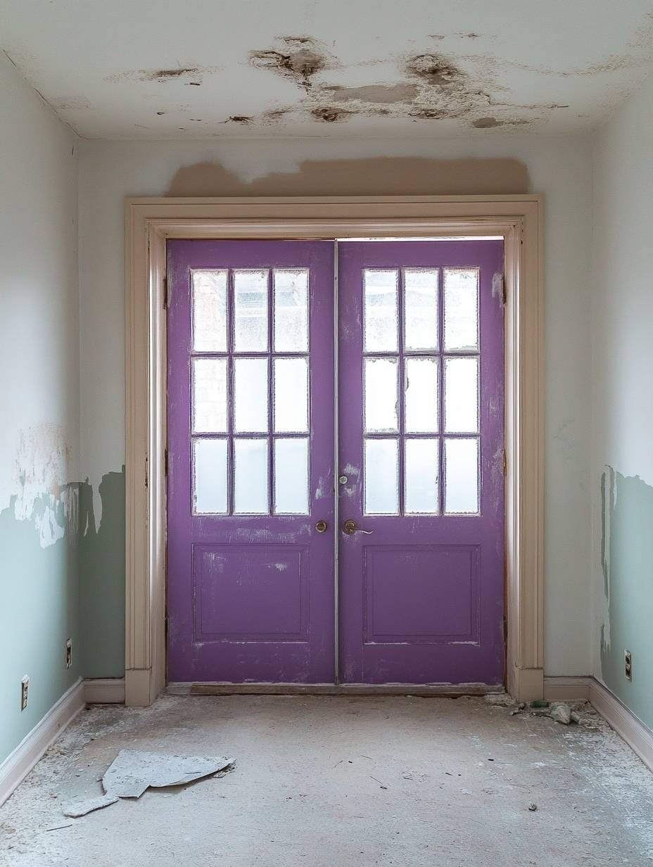 Una foto de puertas dobles moradas con vidrio esmerilado en el medio, en una habitación vacía siendo pintada de blanco al estilo de una habitación vacía siendo pintada de blanco.