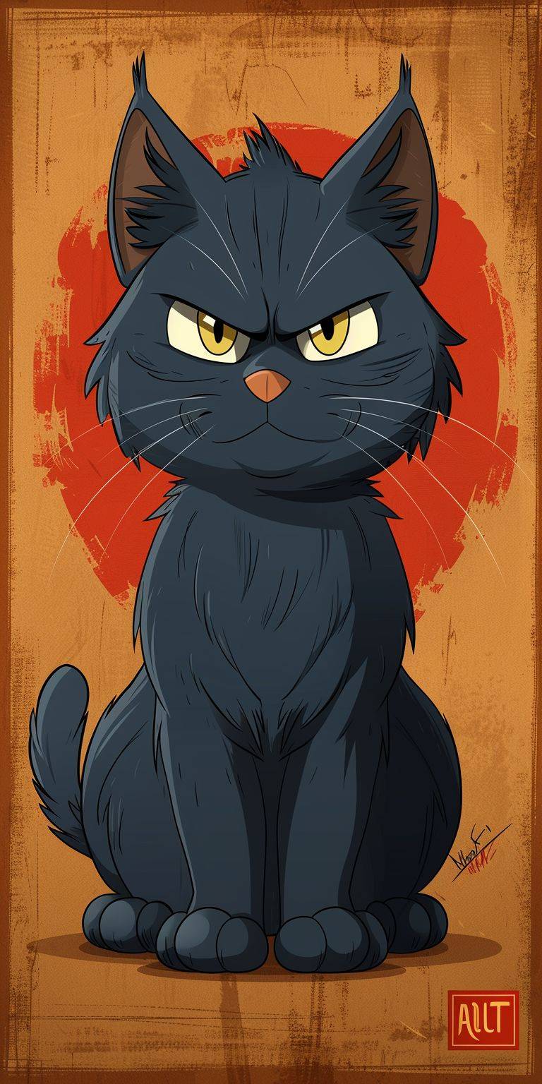 Una versión de cartoon de un gato al estilo de Clive Barker, mostrando lenguaje corporal emotivo y montículos afilados, reflejando la generación del ego posterior a los 70.