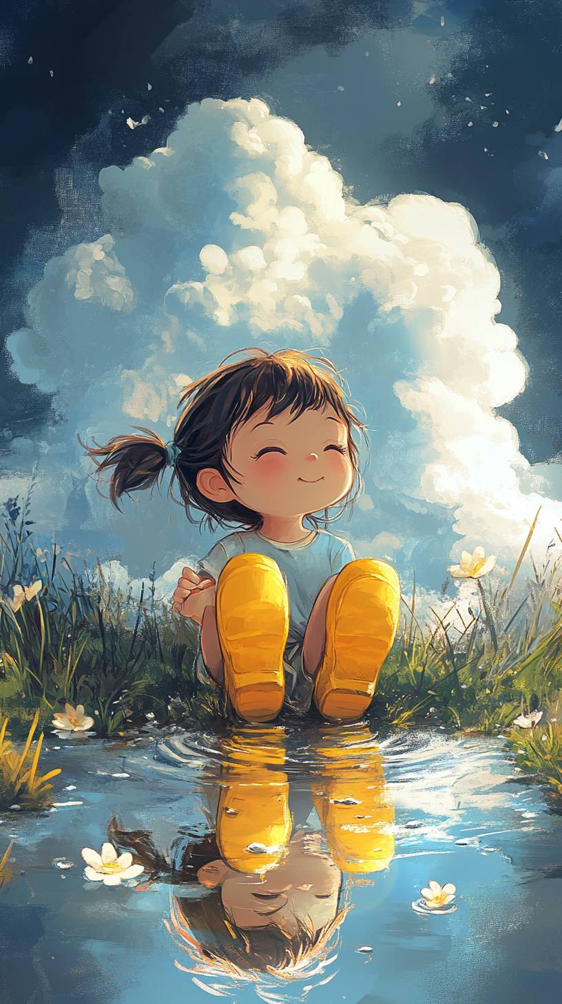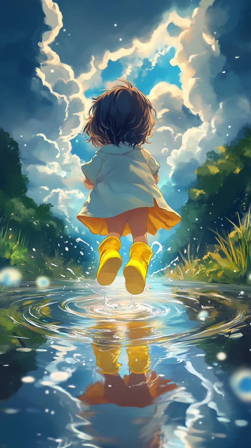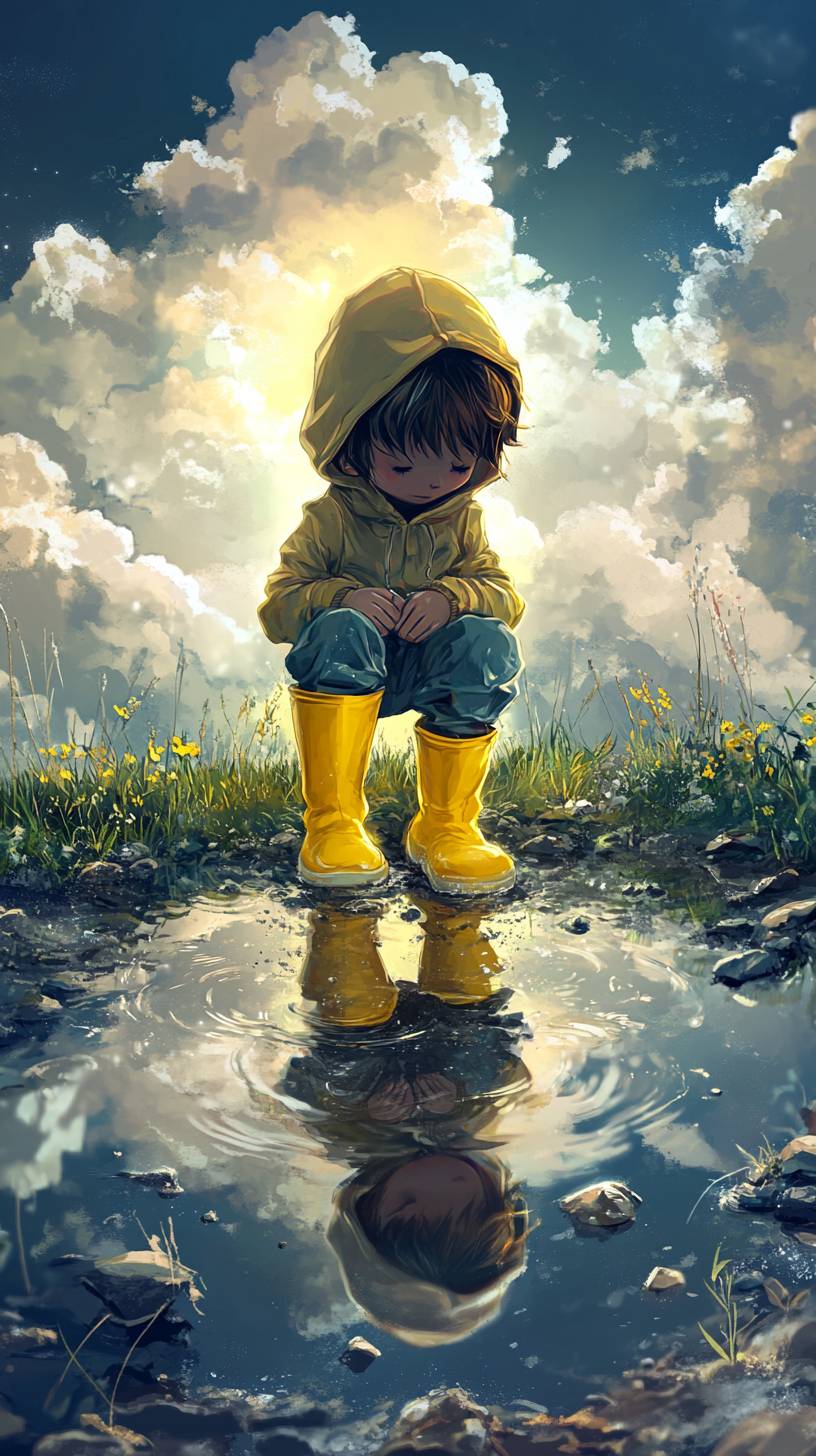 A chibi-child,A puddle that captures clouds.Yellow boots.Splashing around.Chance is peeking through with the sun.playful and carefree, --v 6.1 --ar 9:16