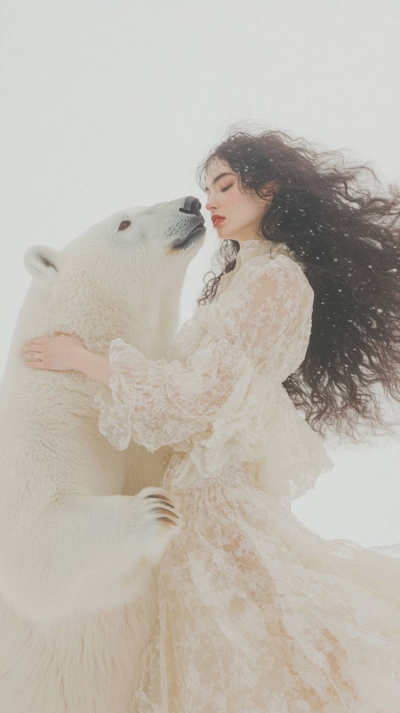 magazine cover, side view, a woman in a long dress jumping forward next to a hug polar bear with , white solid background, Leica S3, prime lens --ar 9:16 --style raw --personalize i2zwuxc --v 6.1