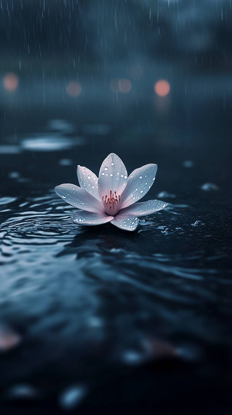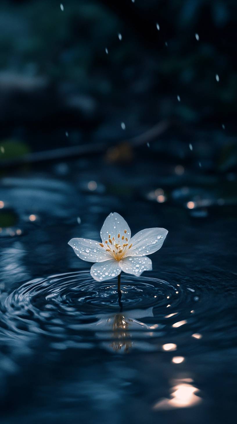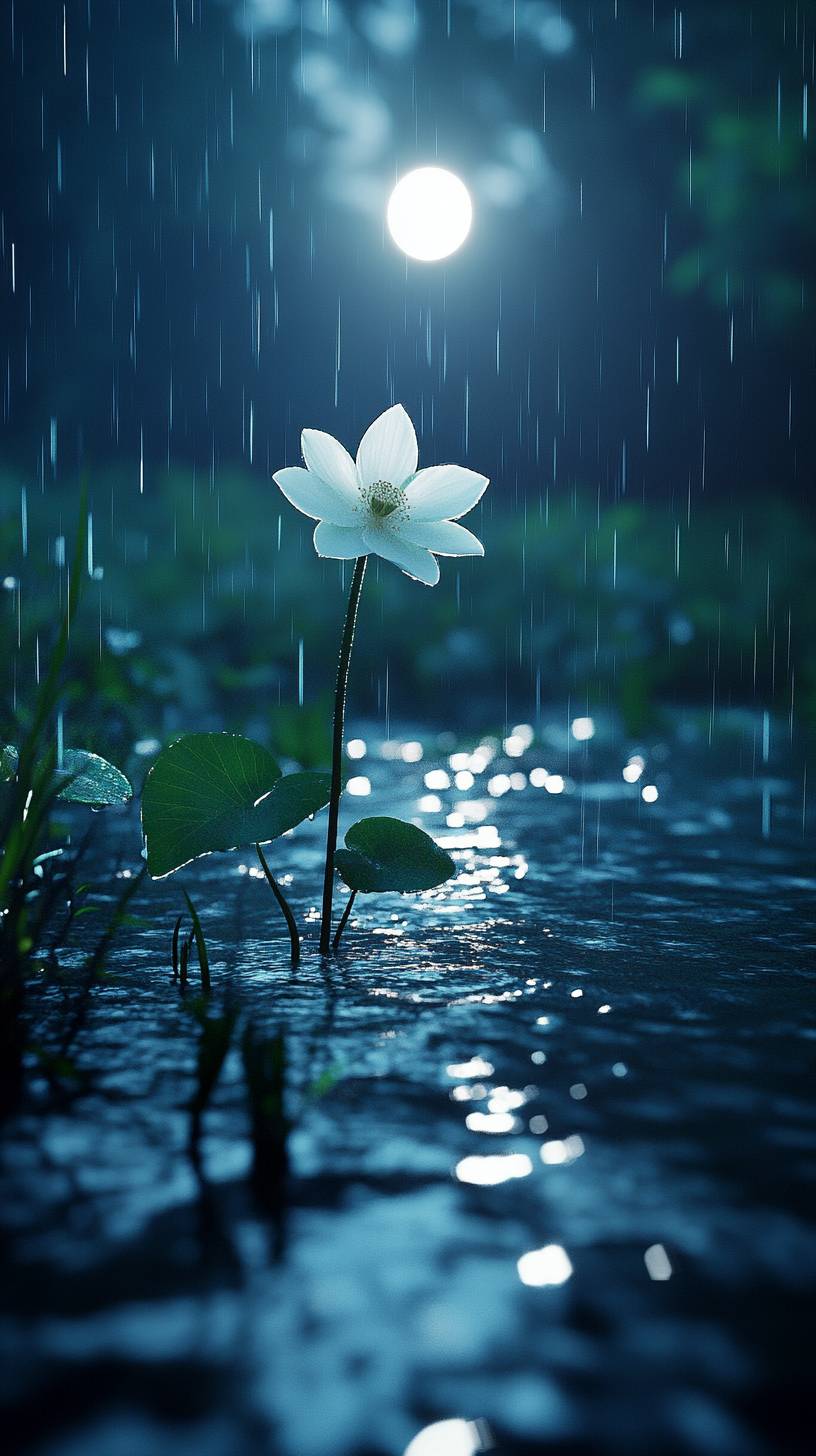 A single flower blooming by the riverside on a rainy night, illuminated by the soft glow of the moon. The scene is serene and mystical, with raindrops creating gentle ripples on the water and the flower standing out against the dark, wet surroundings. The image is captured with stunning detail, as if taken with a SONY α7R IV and Leica 11678 lens. The focus is on the delicate beauty of the flower, its petals shimmering in the moonlight, contrasted against the deep blues and shadows of the night. The scene is hyper-realistic, with vibrant colors and intricate textures that emphasize the quiet elegance of nature. --ar 9:16 --v 6.1