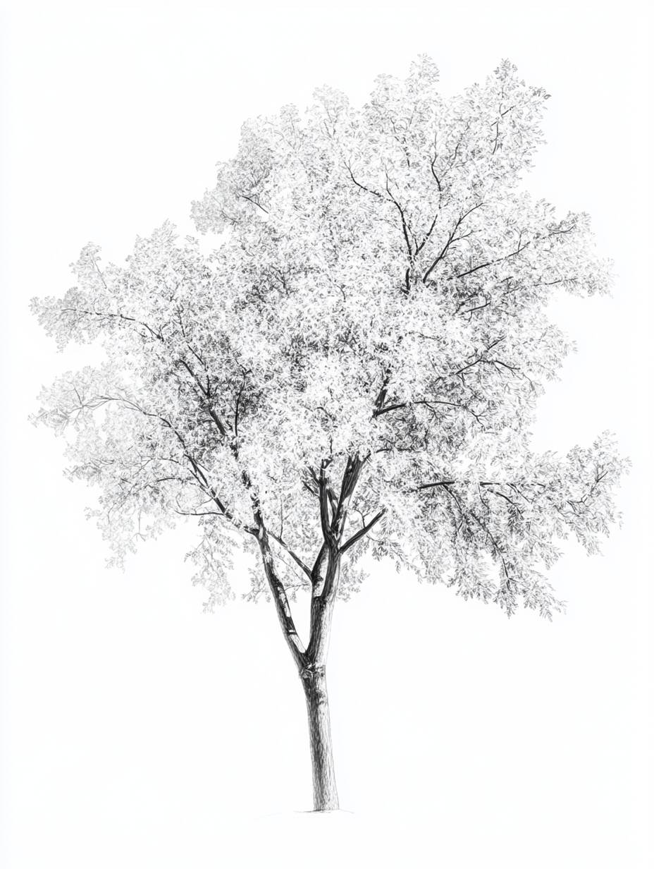 Dibujo lineal transparente en blanco y negro de un álamo en un fondo blanco.