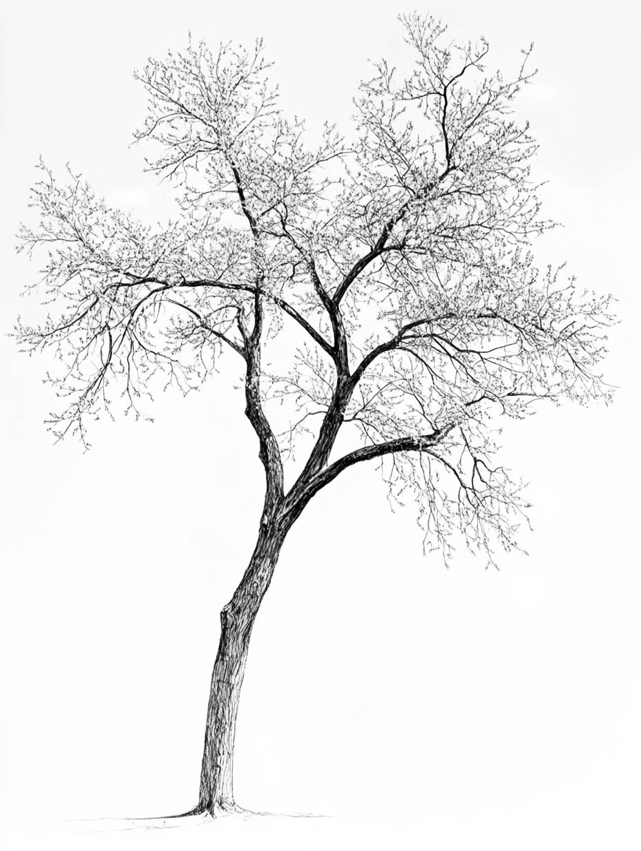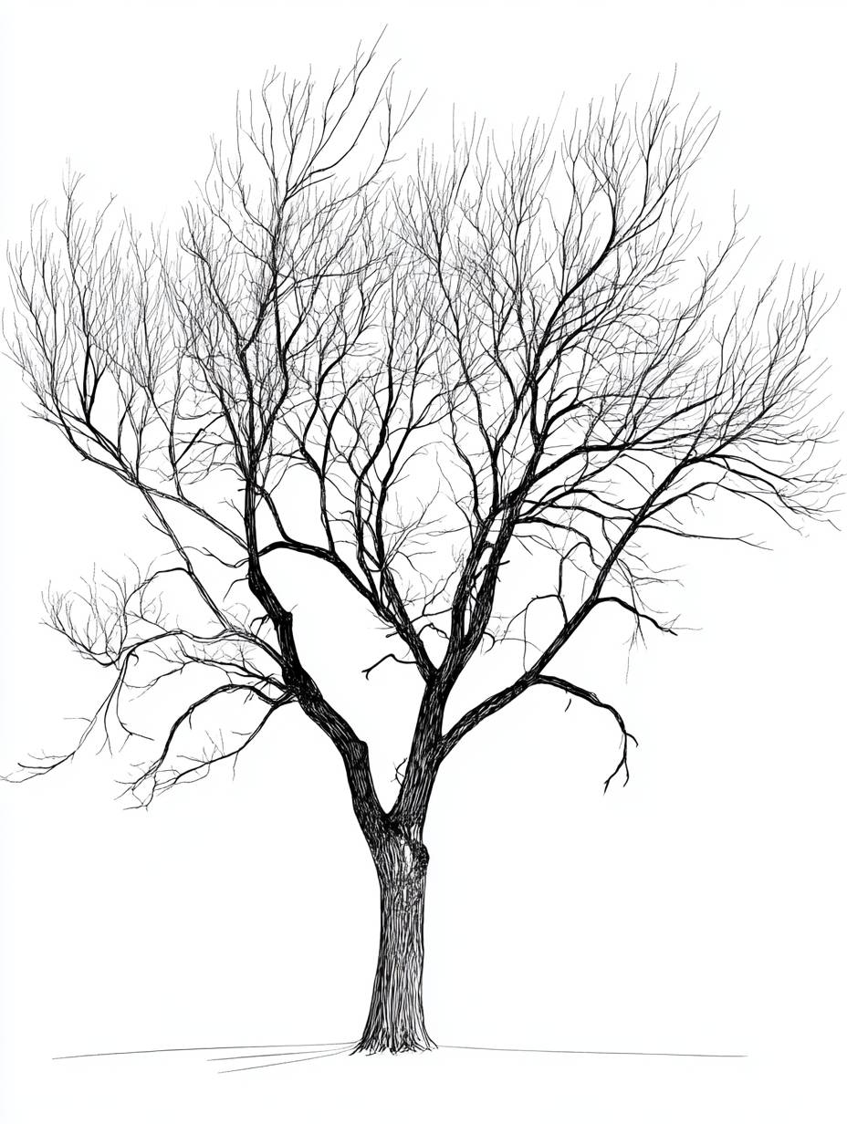 black and white transparent line drawing of a cottonwood tree, white background, delicate drawing with no shadows or shading; --ar 3:4 --v 6.1
