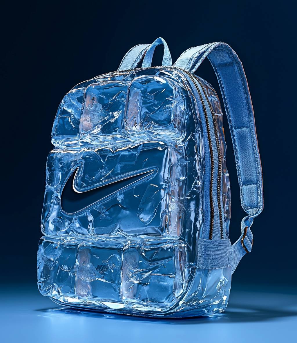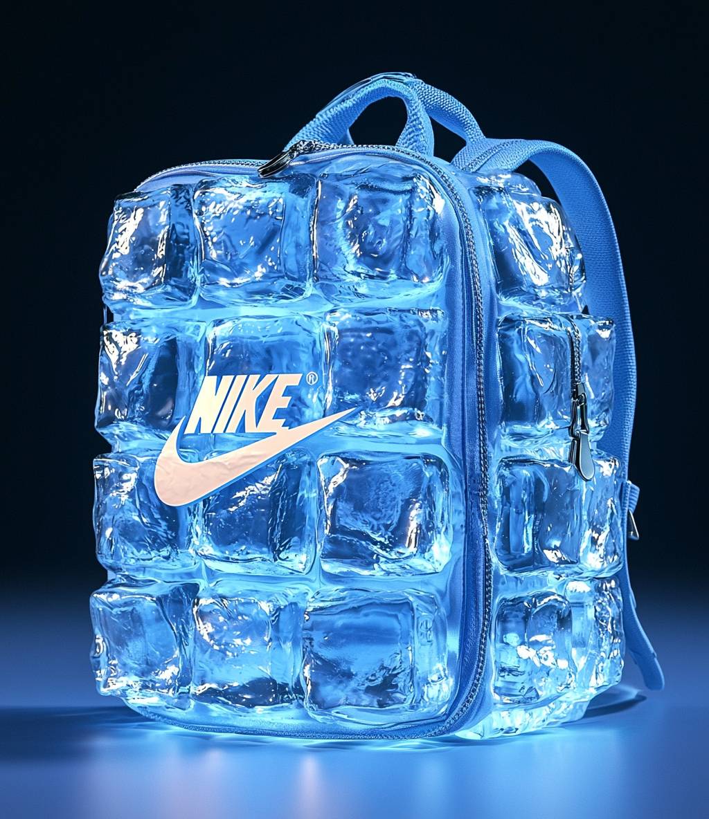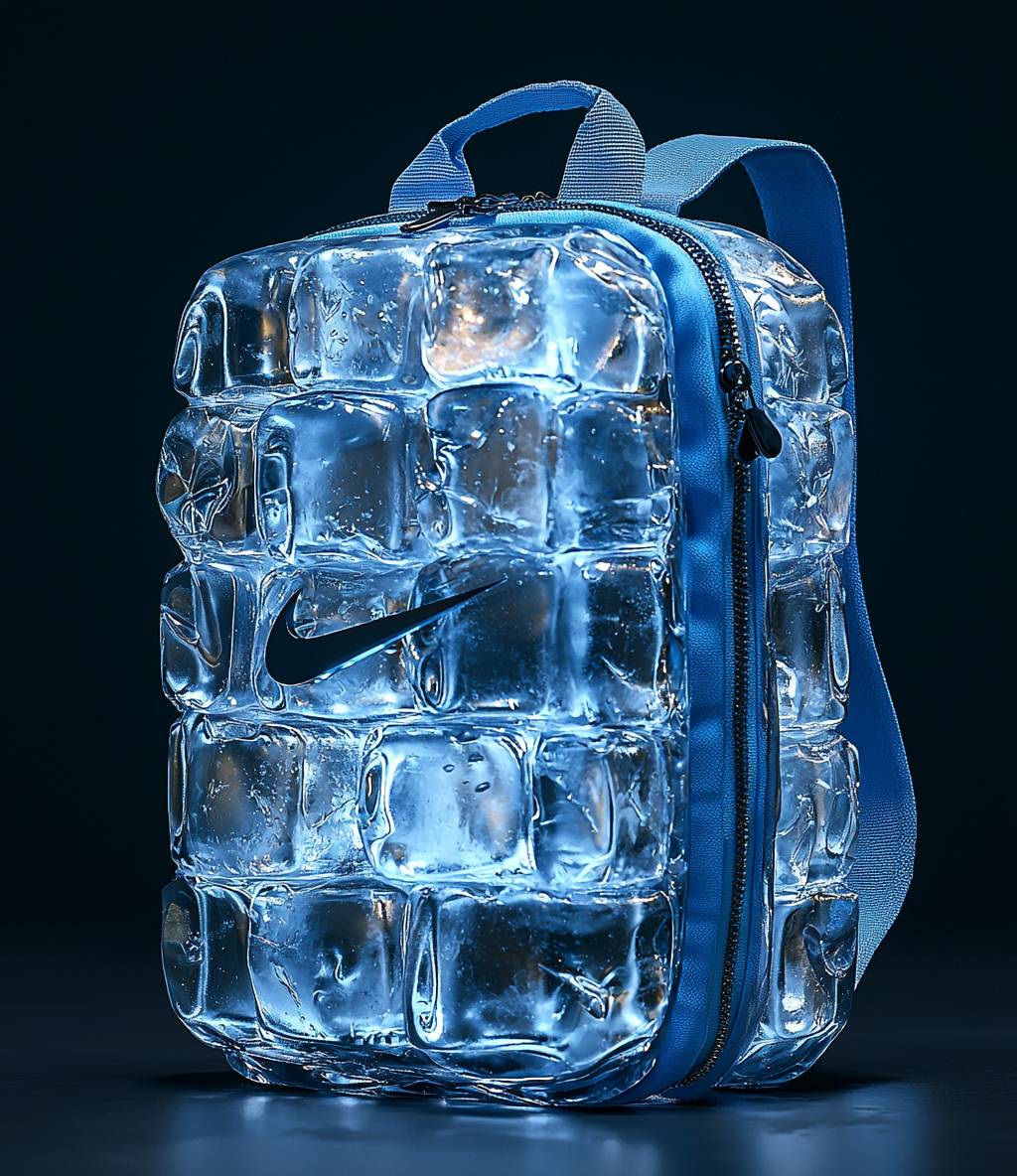 Una mochila de Nike hecha de cubos de hielo reales, azul, con el logo de Nike impreso.