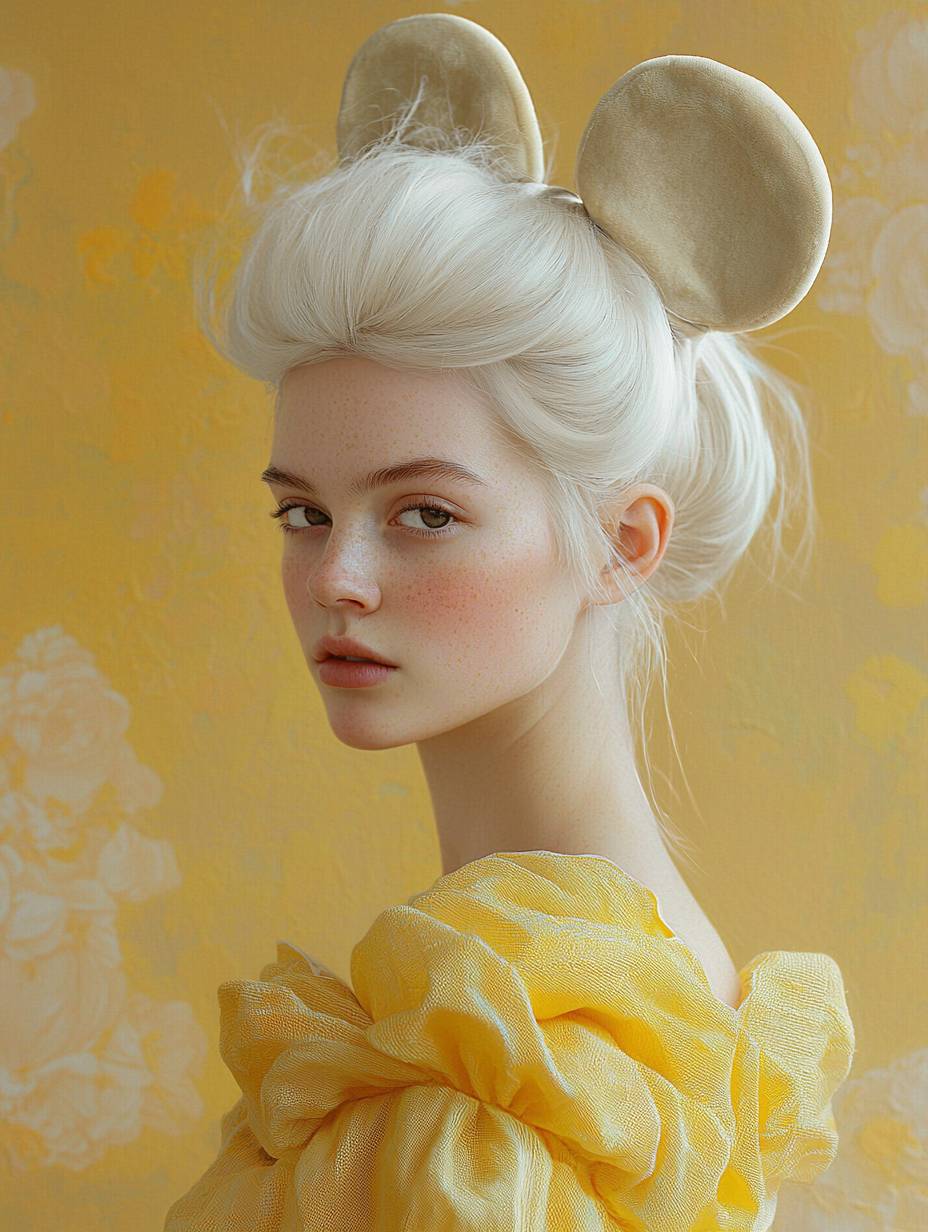 La joven mujer edwardiana de cabello blanco recogido en un moño tiene grandes orejas de ratón de terciopelo en la parte superior de su cabeza, con luz directa iluminando su rostro en tonos amarillo claro y ámbar claro. Representa inspiración pop, el estilo de Eva Rothschild, encanto naturalista, la influencia de Sophie Anderson y colocaciones de detalles excéntricos.