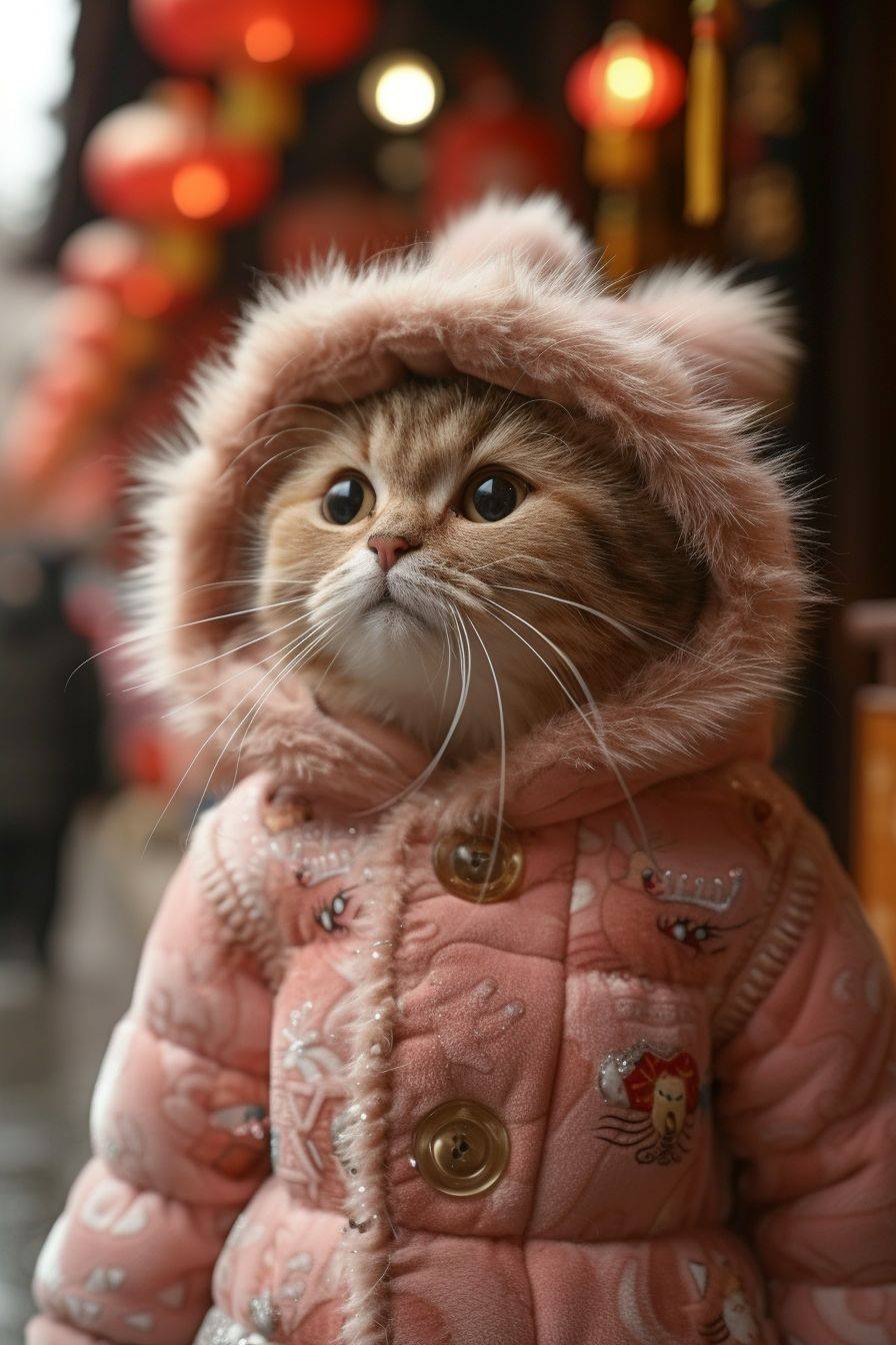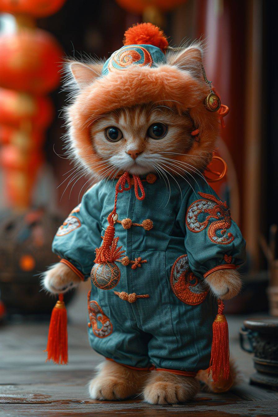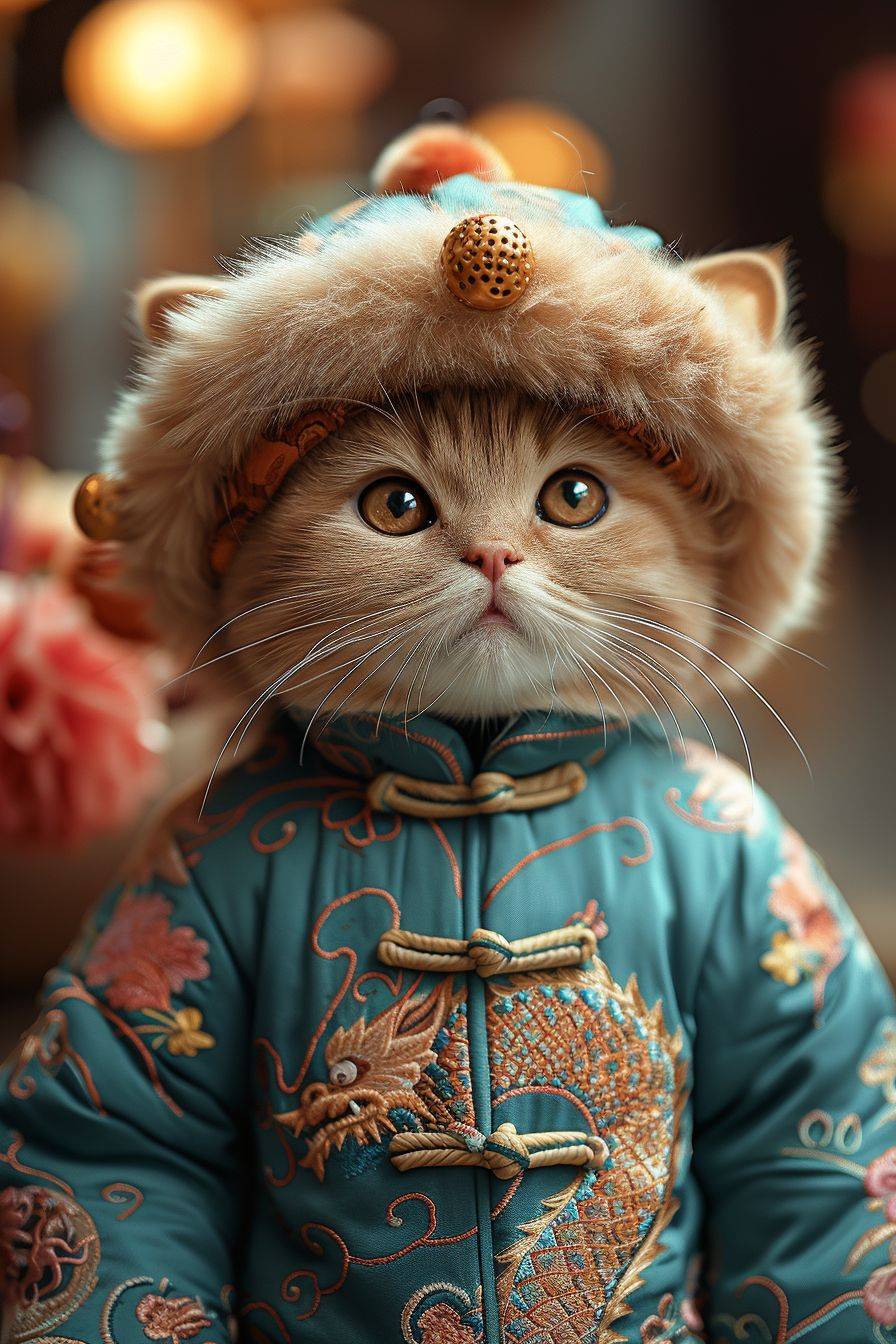 a fluffy fat cat in a jumpsuit resemble a dragon doll, cerebrating chinese new year in many different world landmark, cute costume, pastel color, cheerful lighting, ultraHD, photorealistic, happy mood --ar 2:3 --v 6 --stylize 750