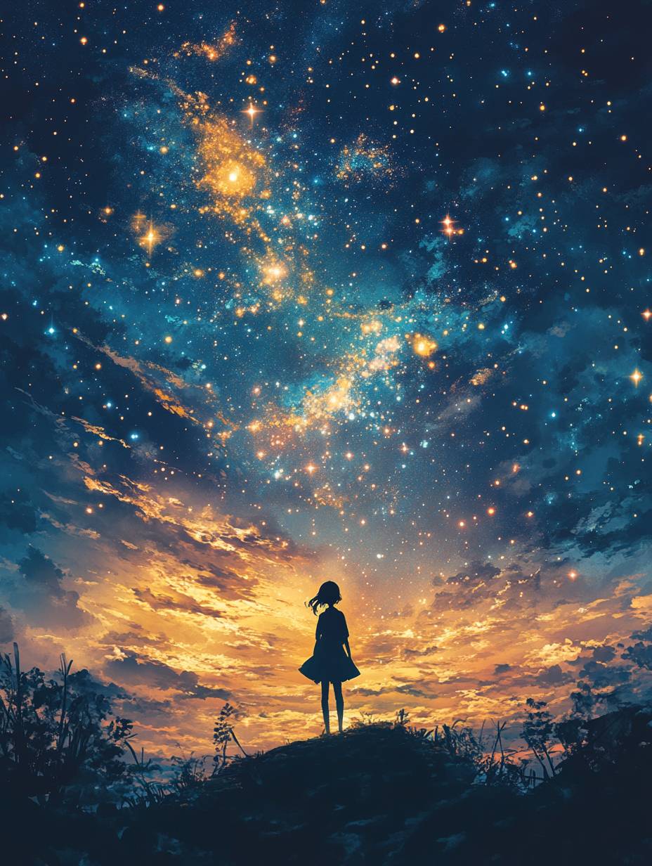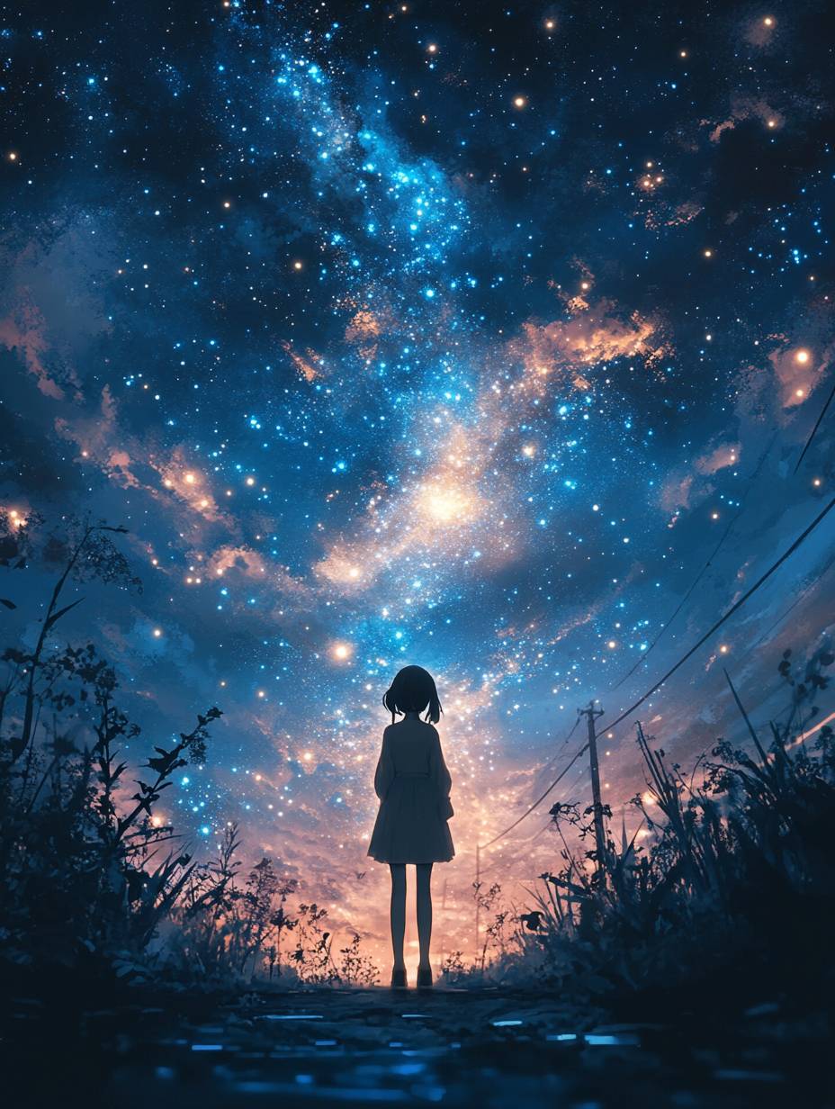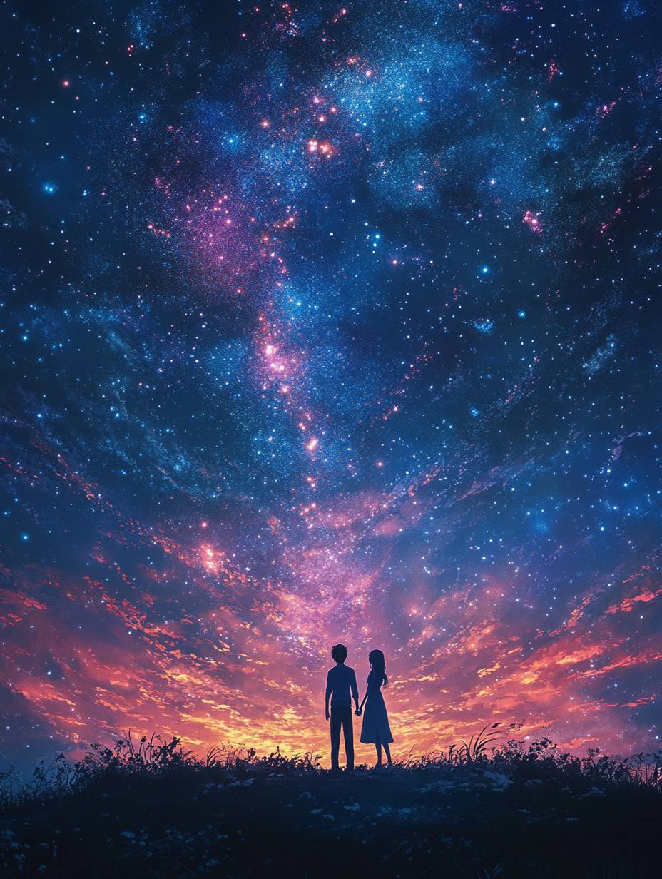 Between the stars, simple background, novel cover, manga cartoon style, Shinkai Makoto style, high saturation high definition. --ar 3:4 --stylize 250 --v 6.1