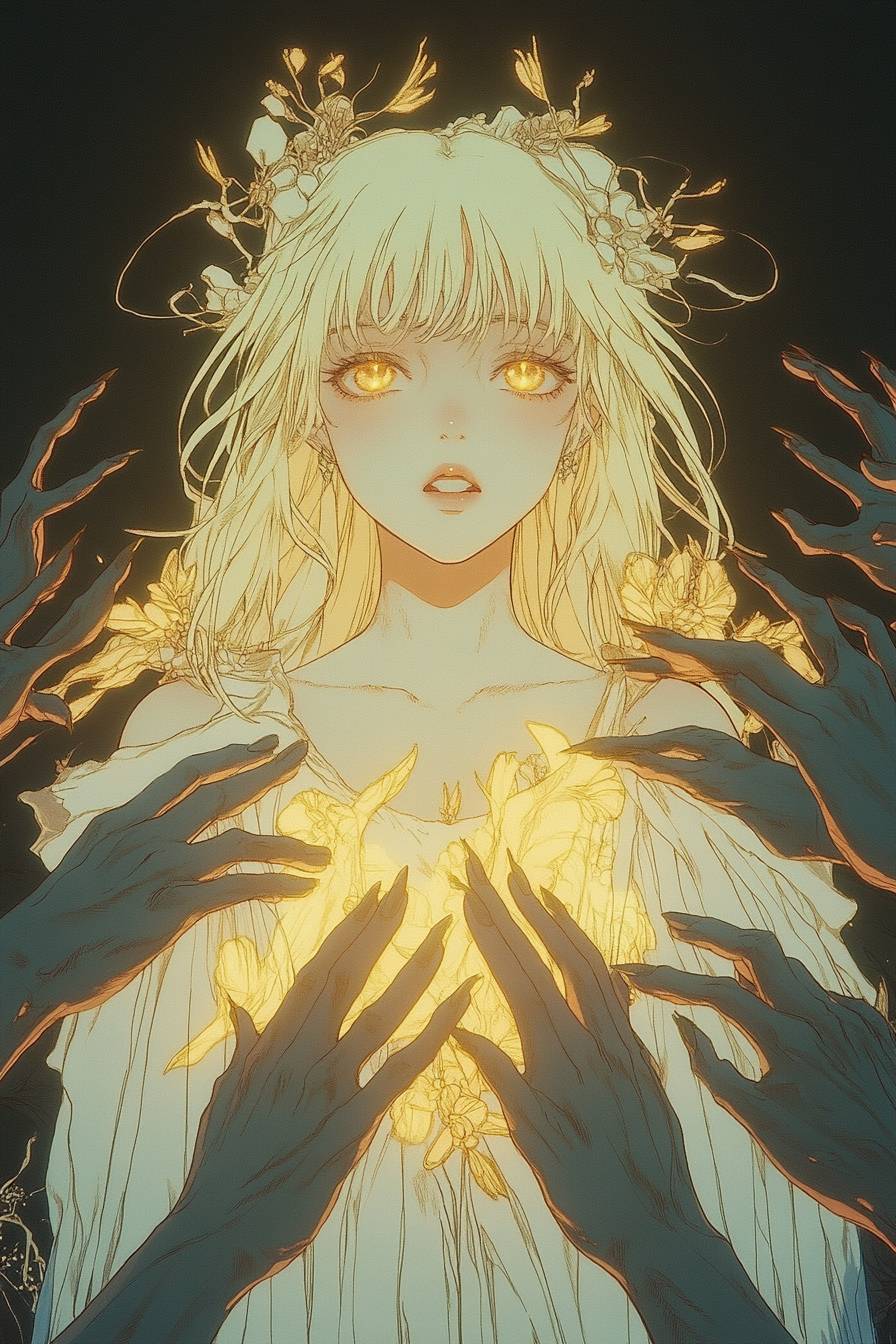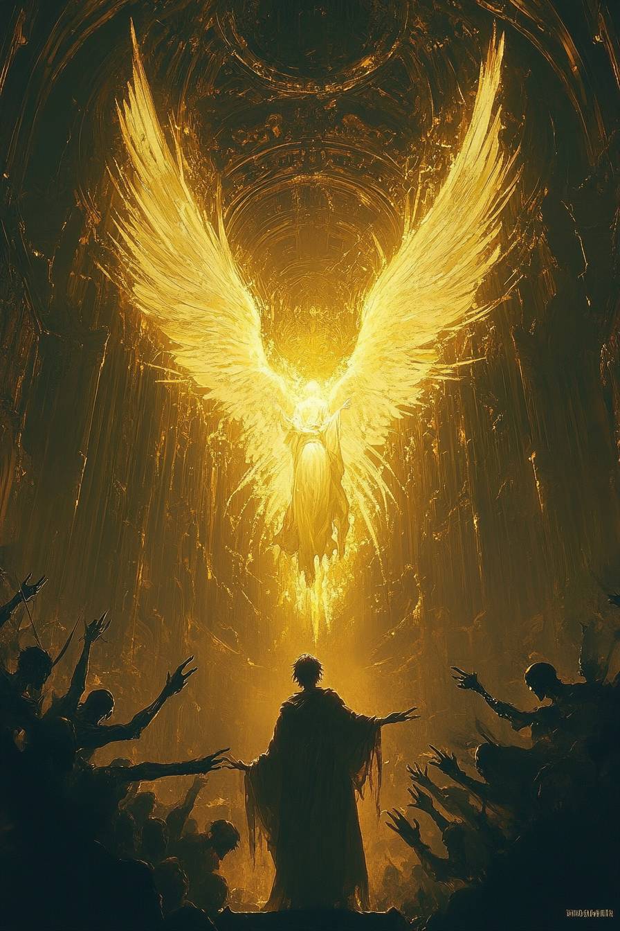 1980 anime still frame of a beautiful angel made of yellow light descending in the world of darkness, several demons mixed together extend their hands to reach her, epic scene, iconic composition, biblical imagery, extremely detailed piece, retro anime --chaos 6 --ar 2:3 --personalize b9c72zm --stylize 750 --v 6.1