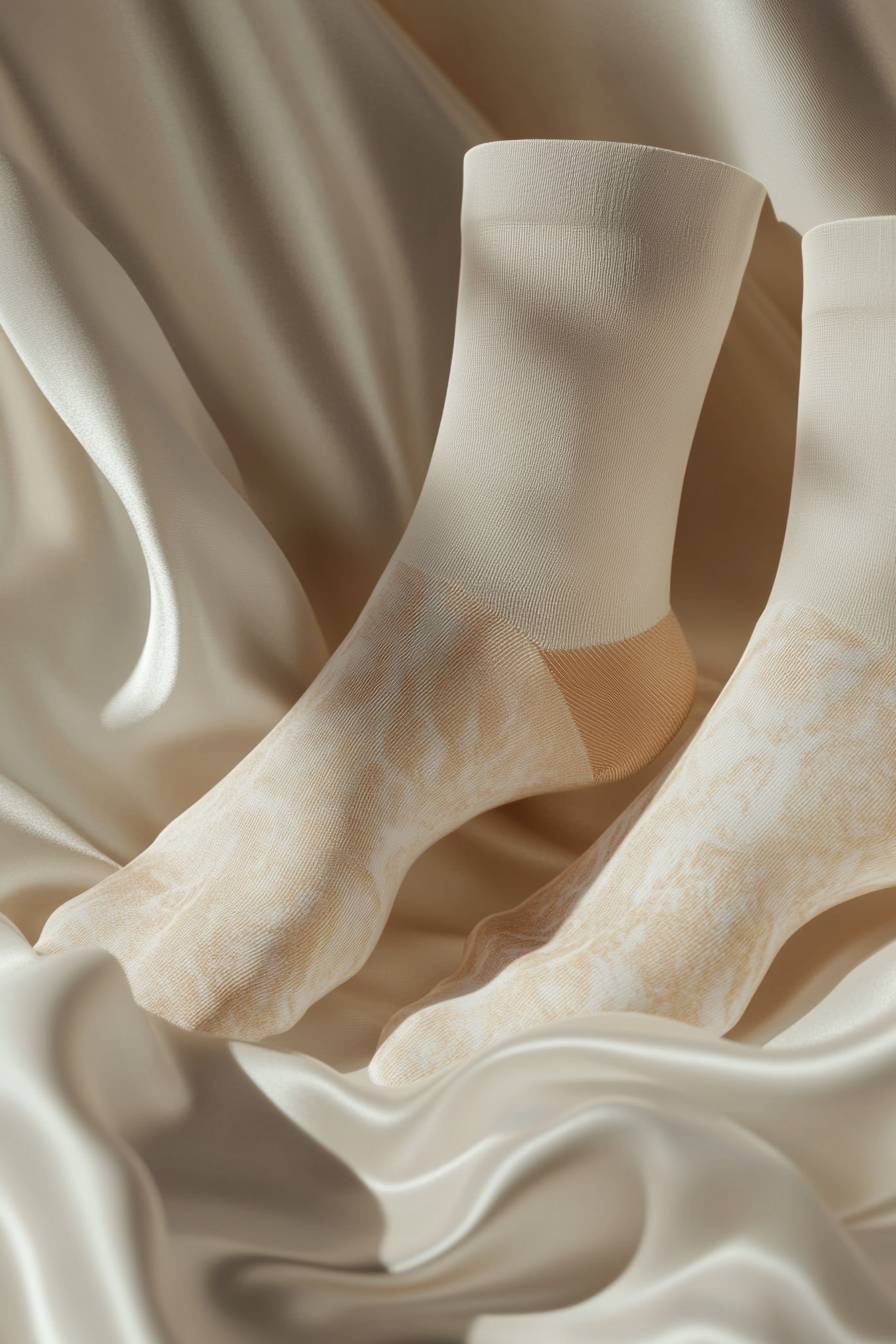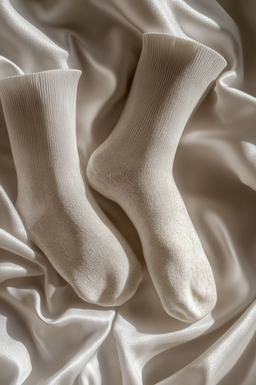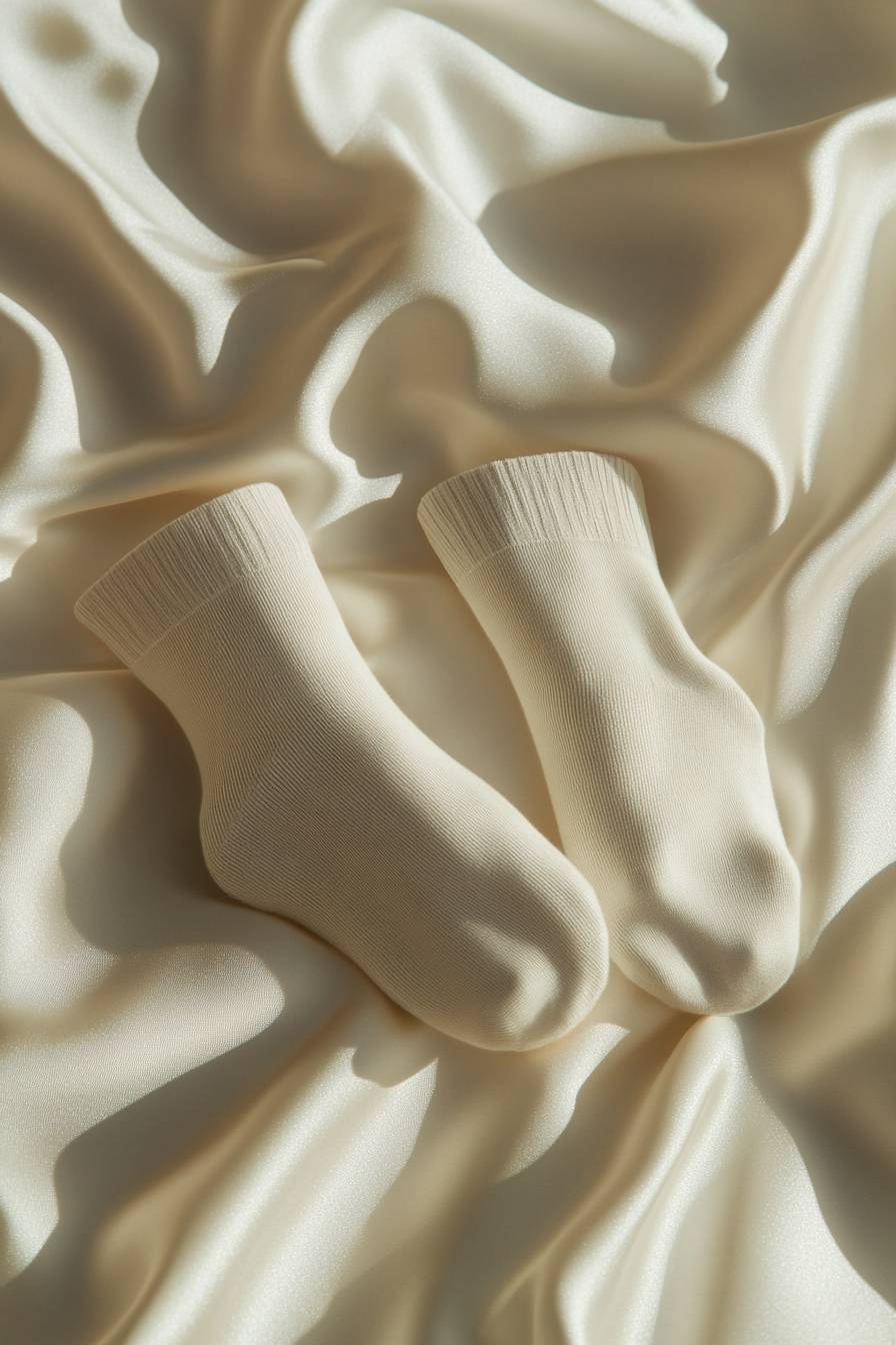 Commercial Photography, Simple Design Luxury socks with designs that mean eternal conjunction, levitation, white lighting, studio lighting, 8k, octane rendering, high resolution photography, crazy detail and detail, white pastel white satin cloth background, stock photography, professional color rating, hyperreal, socks for website banner design, --ar 2:3 --v 6.1