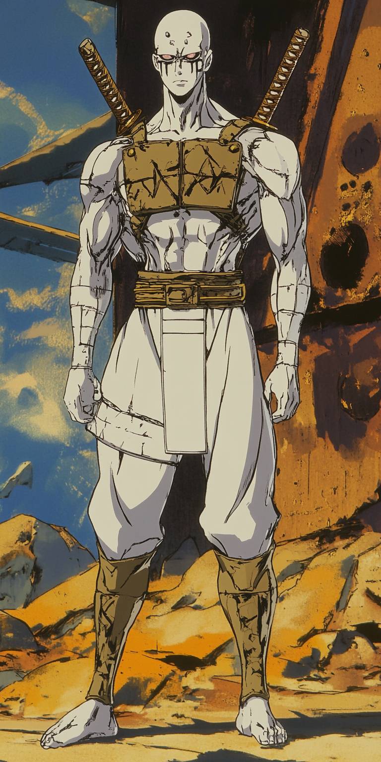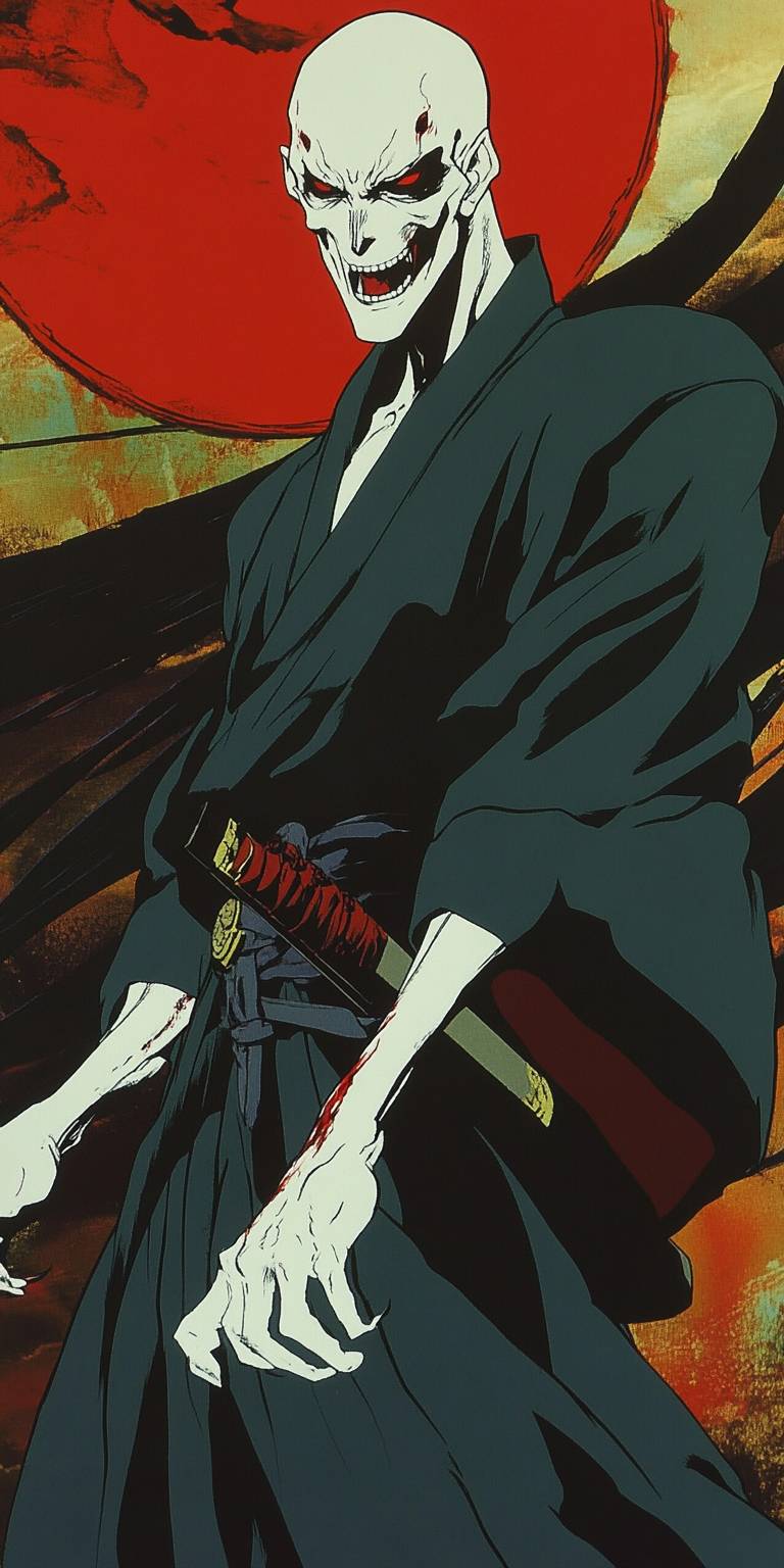 a albino samurai 90's anime, cinematic, 1990s anime cel animation, 1990s anime cel shading, evil dead 1990s anime texture and colors, thicks line work . --ar 1:2 --style raw --stylize 50 --v 6.1