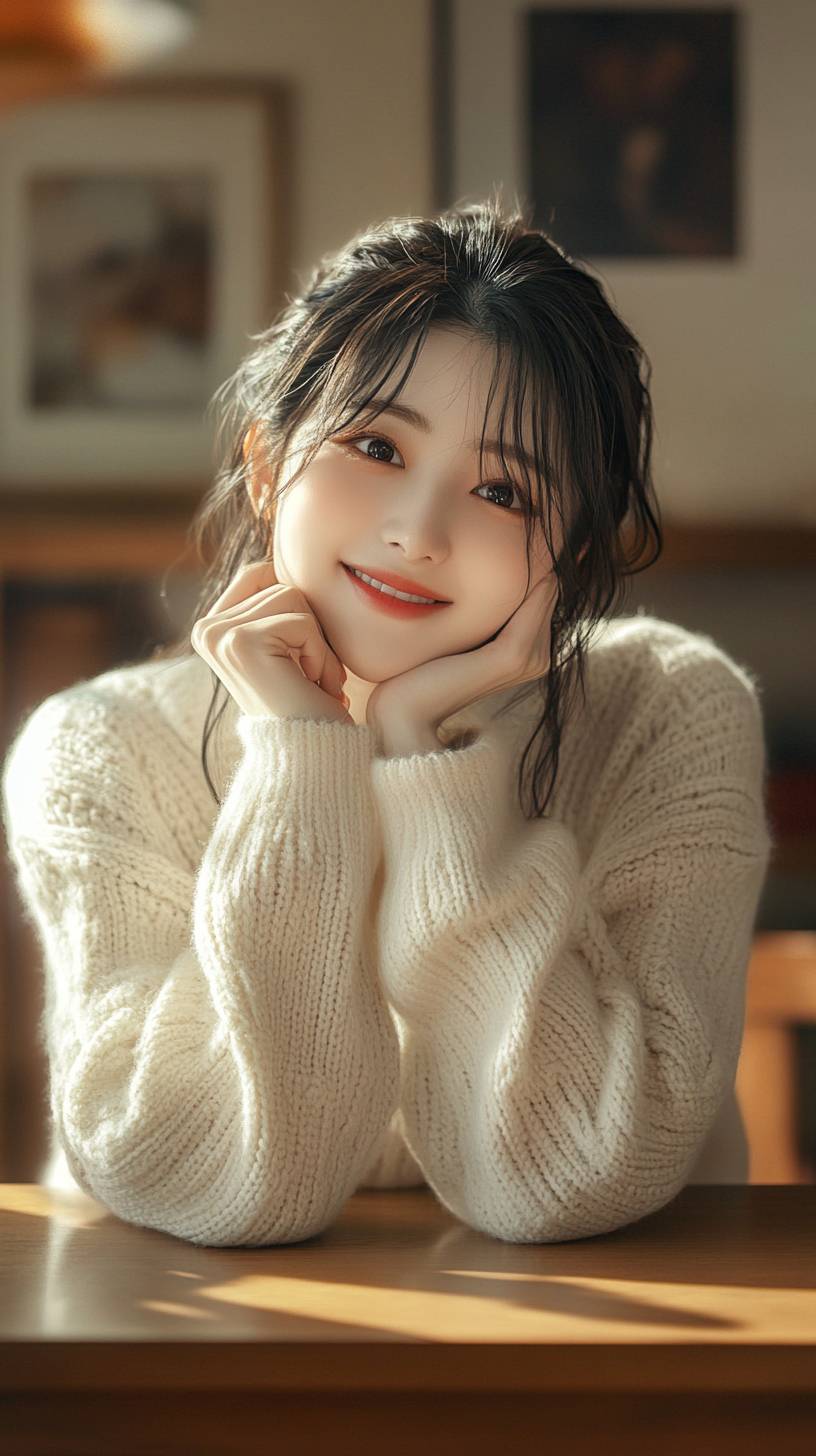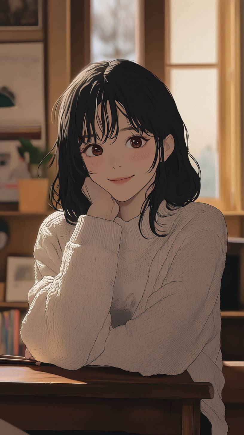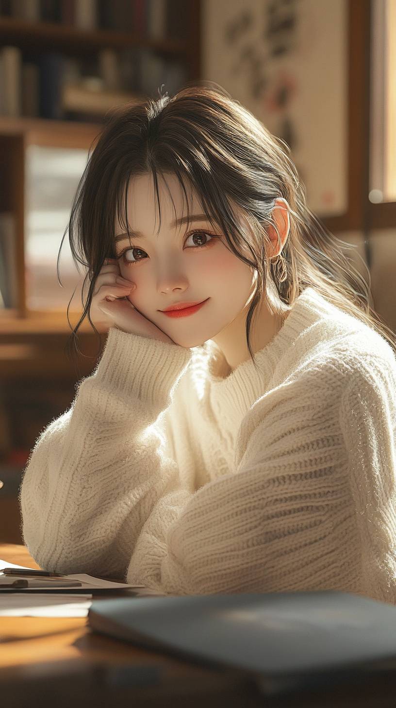 a anime-style woman wearing a white sweater, sitting at a desk with one hand on her chin and smiling sweetly. The background features warm wooden furniture, with a light brown and beige color scheme, accented by subtle shades of light red and dark gray. The overall aesthetic is one of simple elegance, characteristic of the movie poster design, with high-definition details and a touch of Chinese aesthetics. --ar 9:16 --v 6.1