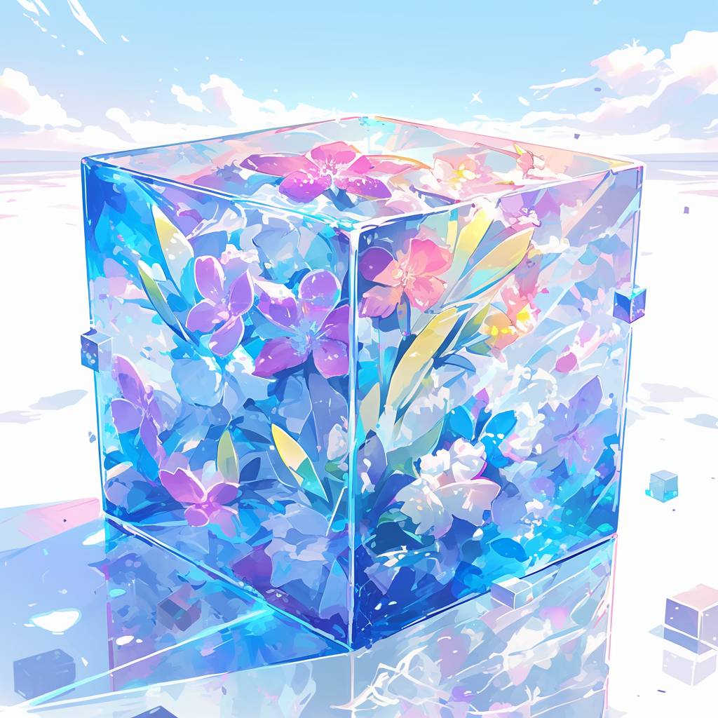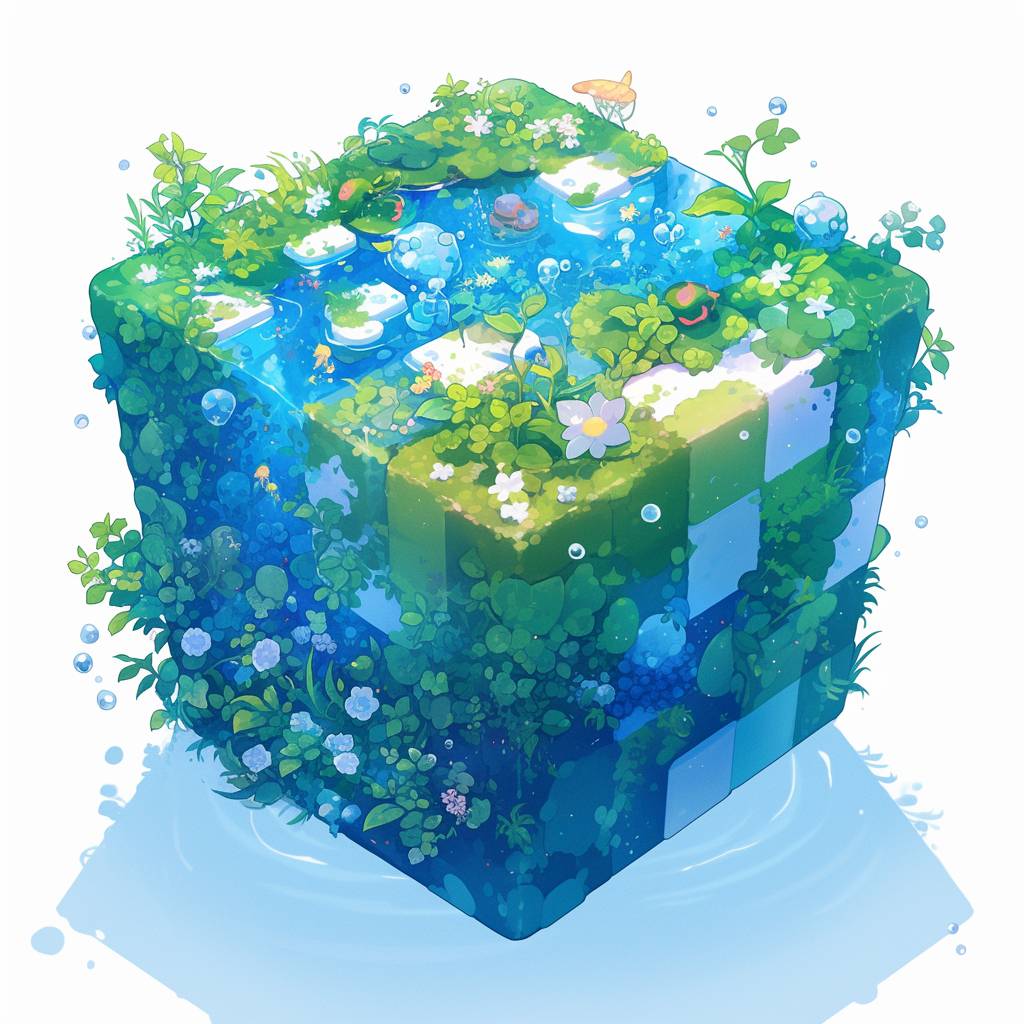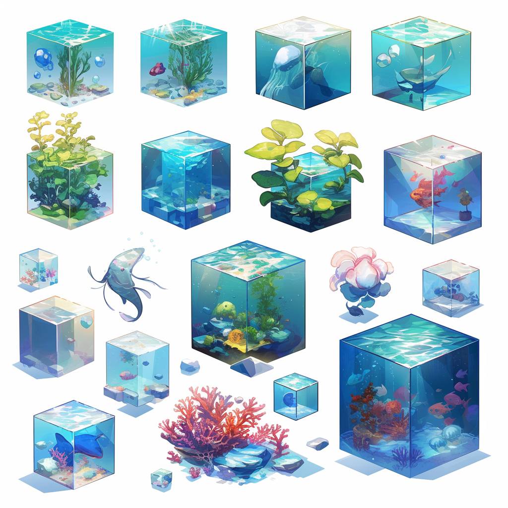 RPG Maker materials, blocks, grid, cube viewed from the front, underwater, flowers underwater, blooming flowers, flower field, white background. --ar 1:1 --niji 6
