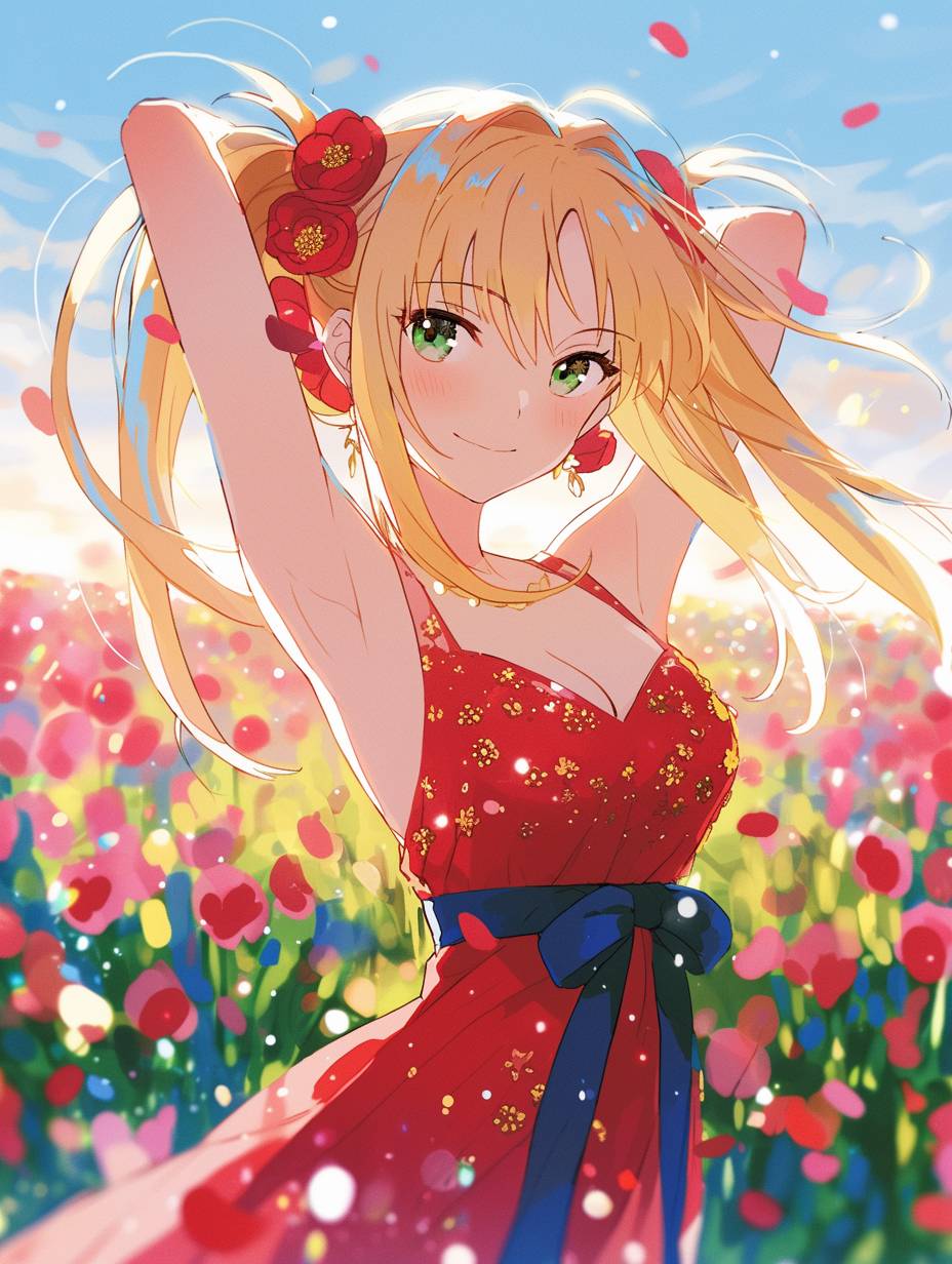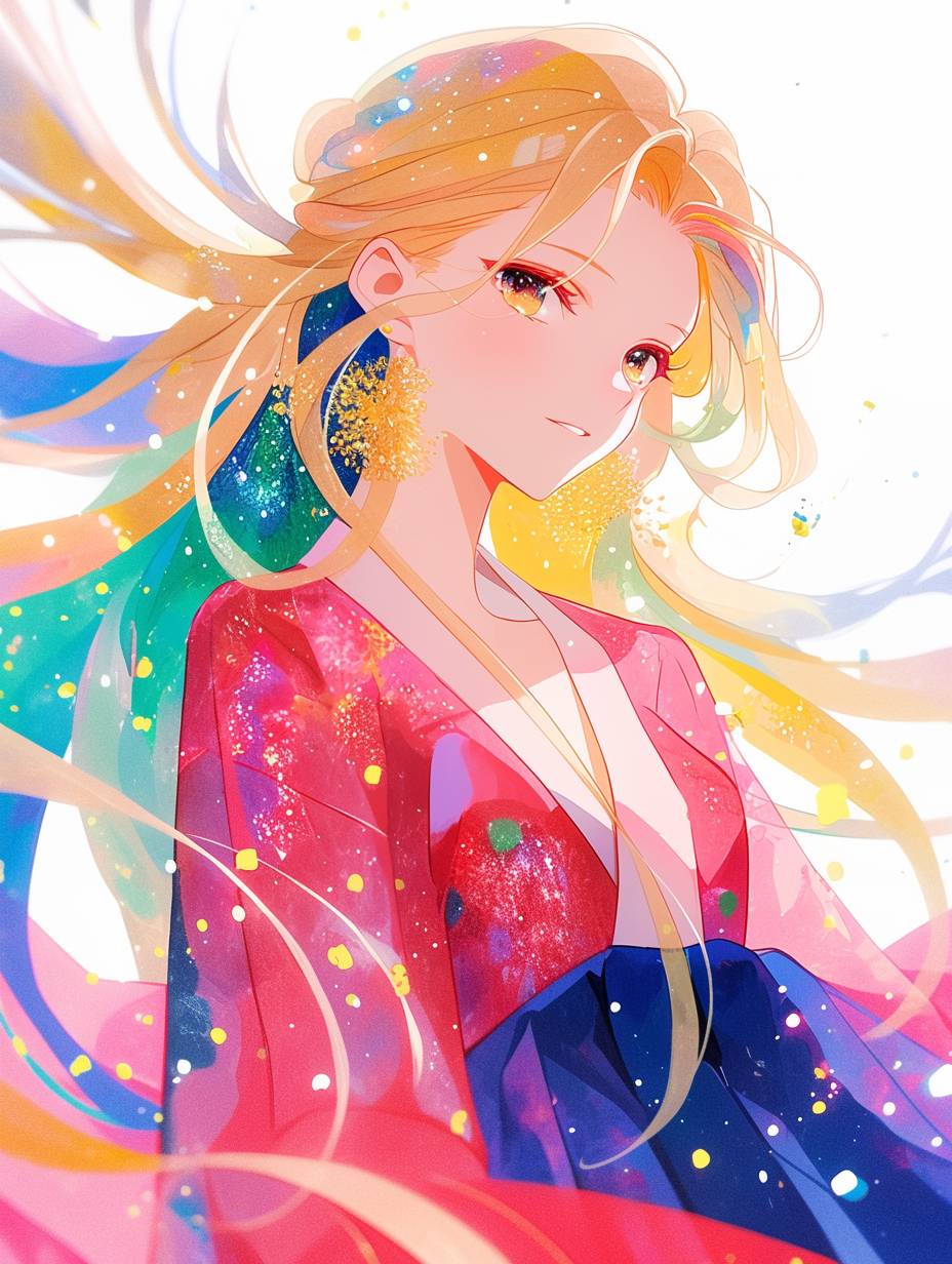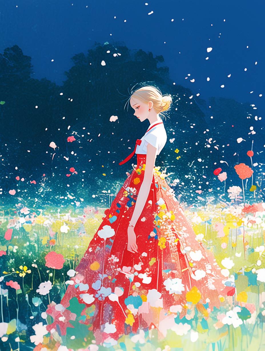 Una mujer rubia lleva un hanbok rojo adornado con bordes de flores doradas. Ella está posando con gracia mientras se encuentra en un jardín floral de color carne bajo un cielo azul uraniano. La escena está iluminada desde atrás, creando un efecto de resplandor a su alrededor, y presenta una profundidad de campo reducida que difumina suavemente el fondo.