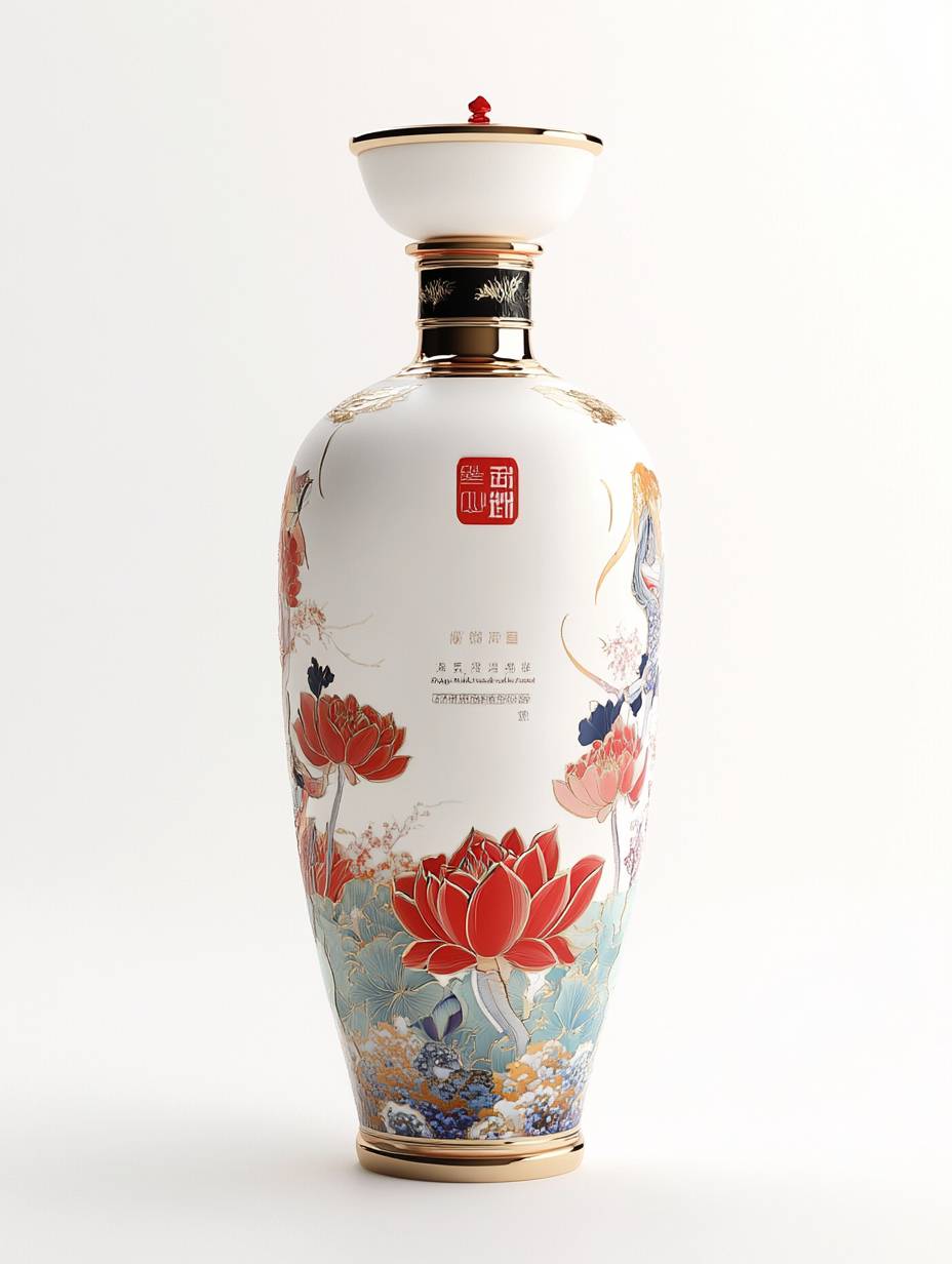 The packaging of this high-end Chinese liquor focuses on the poetry of Li Bai and the ancient imperial spirit, and the bottle is cylindrical in shape, incorporating modern minimalist lines to present a smooth and stable outline. The mouth of the bottle is lotus shape, the body of the bottle is ceramic texture, Chinese red as the main color, and decorated with the emerging Tang Dynasty scroll pattern, with Li Bai's poem, the font laser engraving, low-key and exquisite. The label design is simple, the combination of gilt printing and seal script is adopted, and the overall style is a perfect fusion of classical and modern, focusing on extreme details and high-level texture, presenting a high-end experience of luxury and connotation. C4D, white background --ar 3:4 --v 6.1