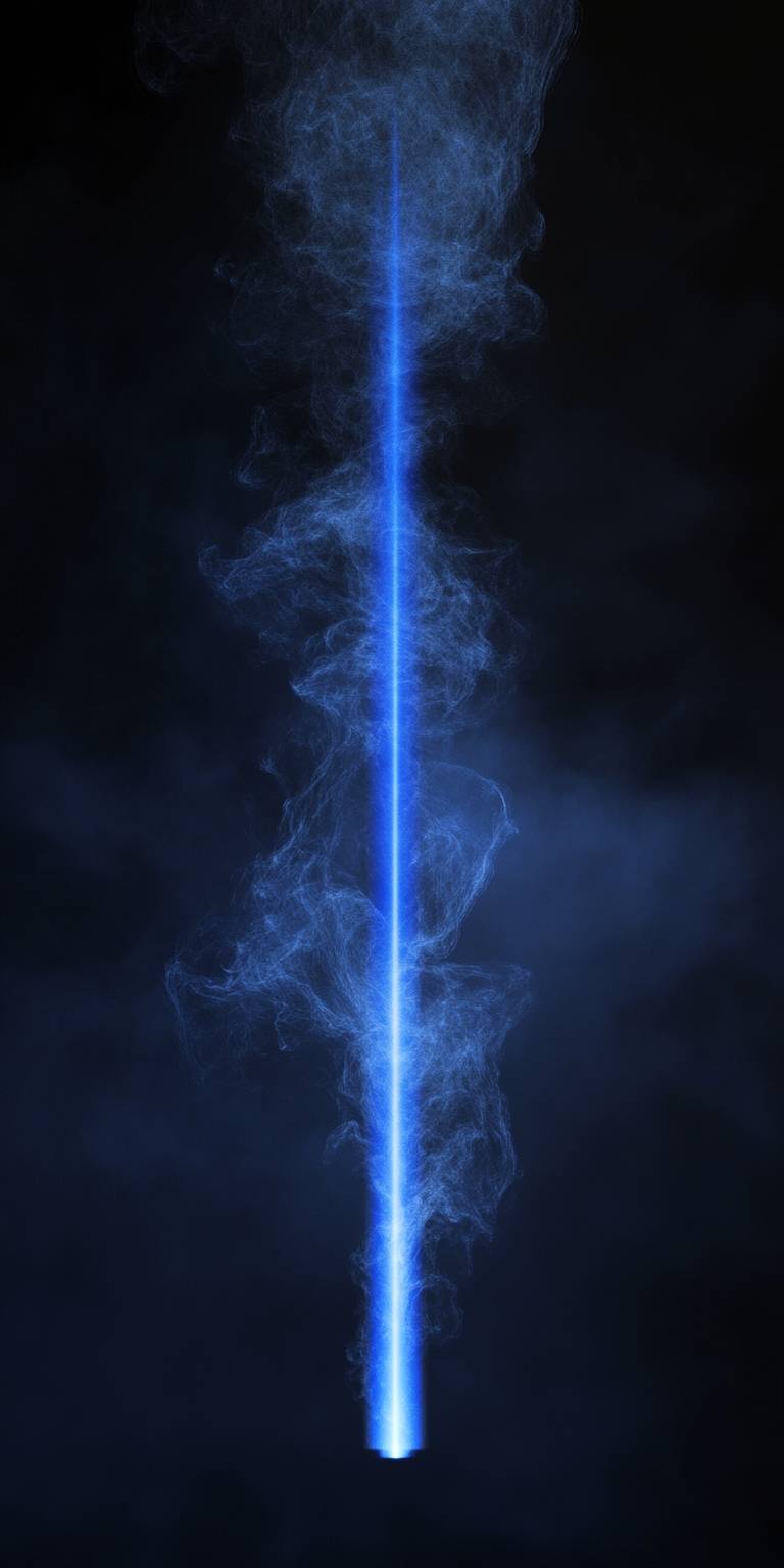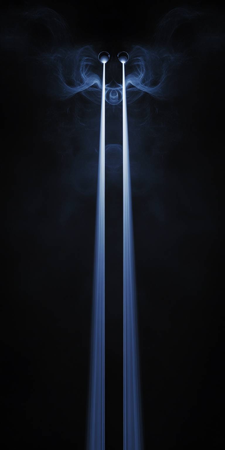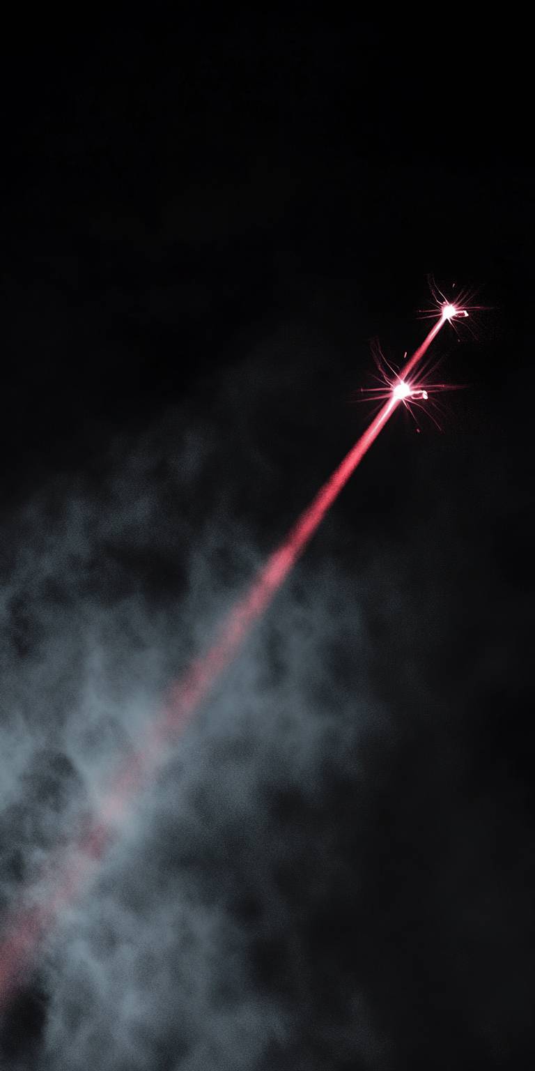 Dos haces de láser que vienen de un solo punto con humo entre ellos.