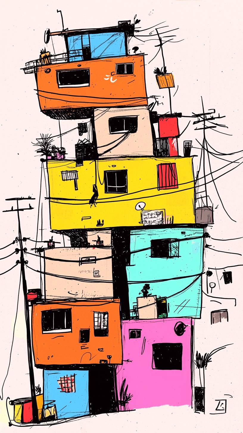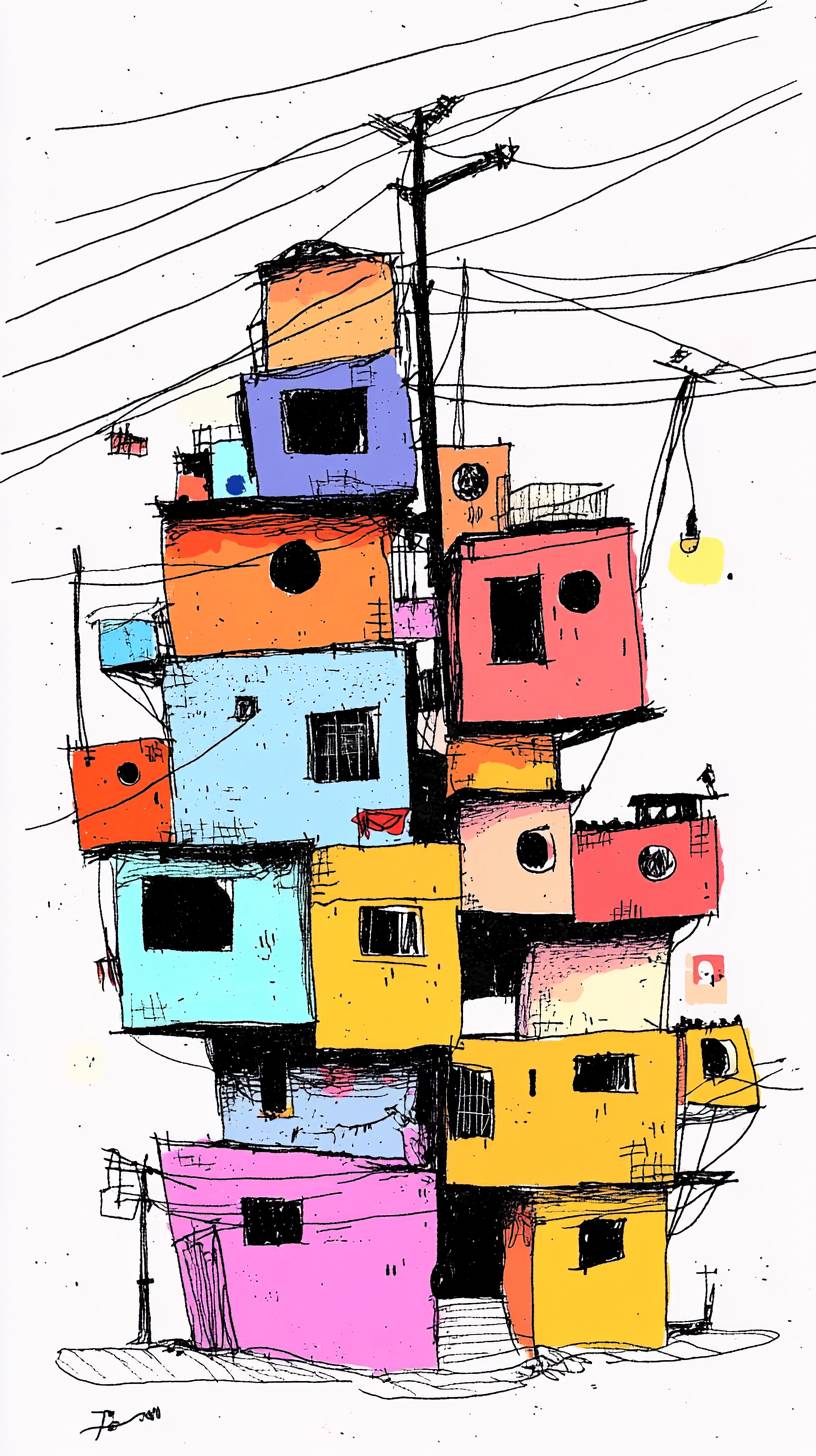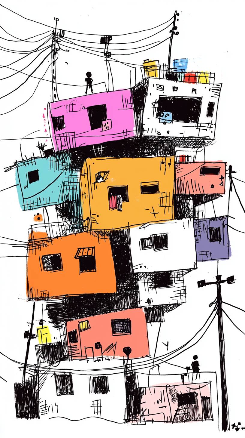 vaporwave cubism art. A simple line drawing of a Brazilian favela in Rio de Janeiro, made from buildings stacked on top of each other, with wires and power lines connecting the structures. The illustration is in black ink against a white background, capturing minimalism with flat design elements. It features bold outlines for clear definition, with muted colors such as grey, brown, peach, and hints of orange. This style emphasizes clarity over detail, focusing solely on shapes without any shading or gradients. --ar 9:16 --quality 2 --sref 3620835572 --personalize phjpkaw --v 6.1