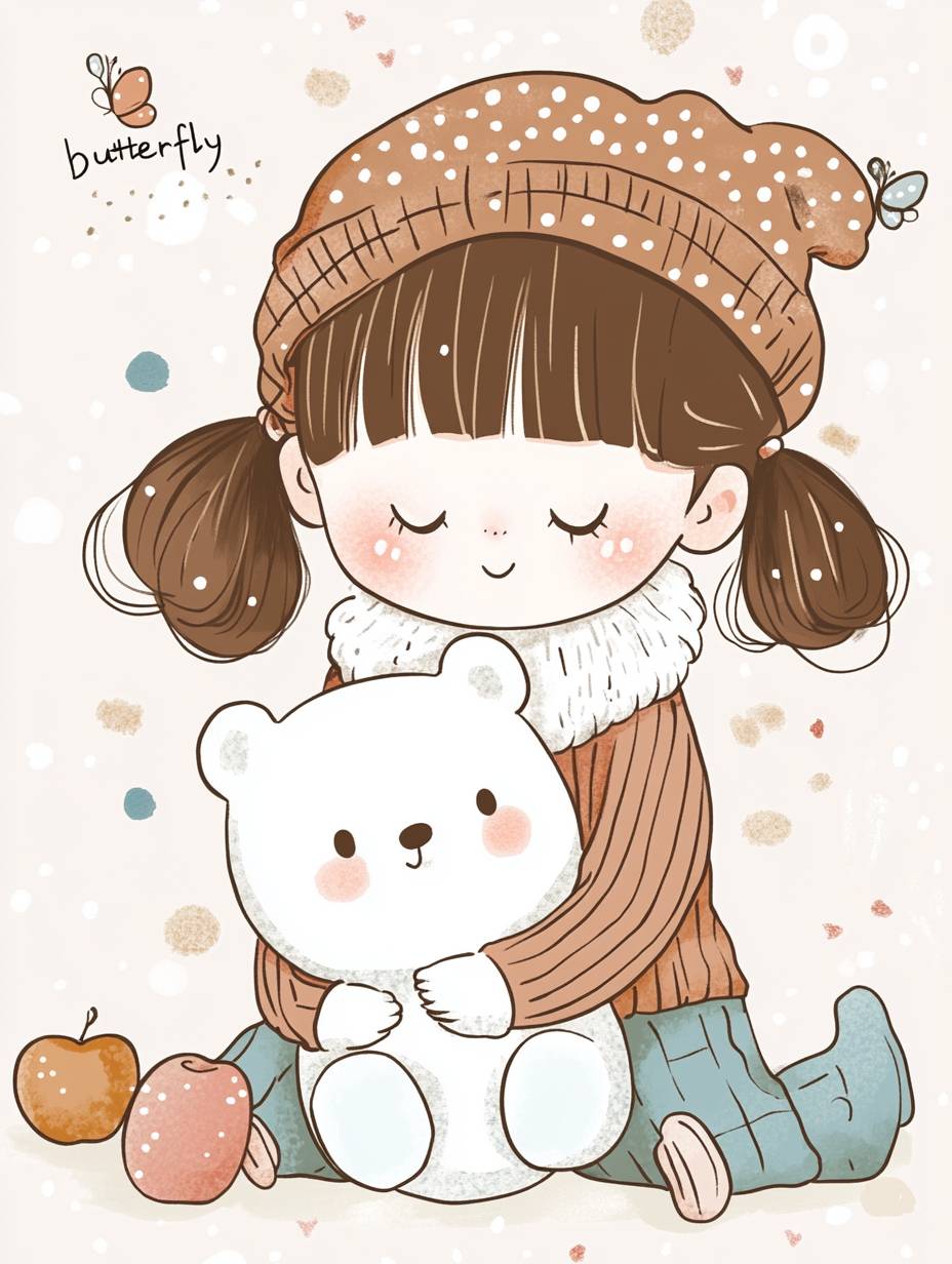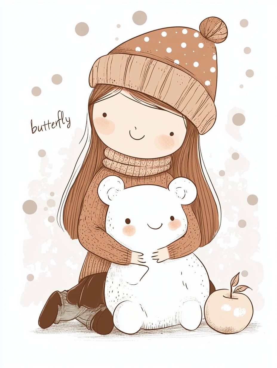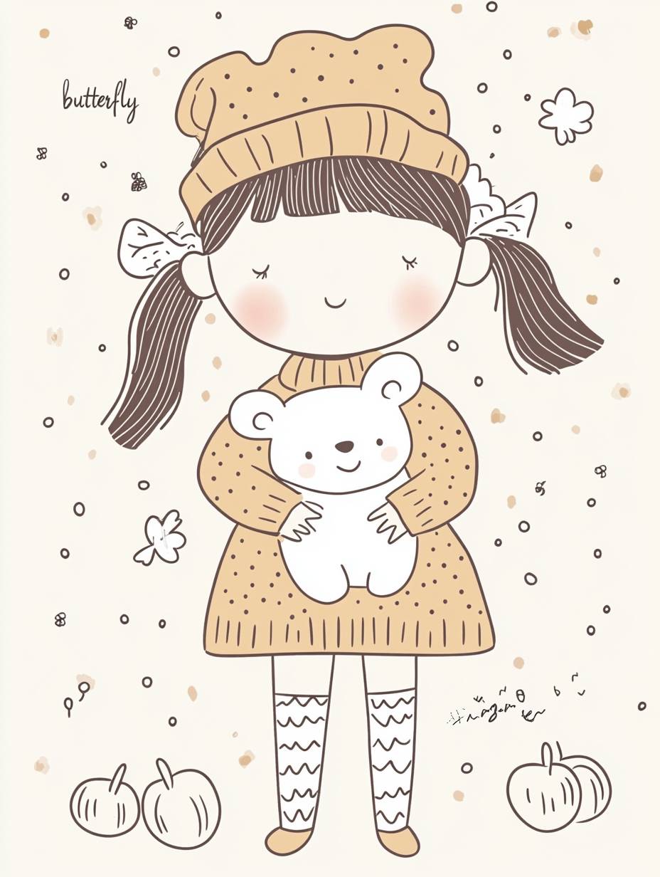 Cute girl with pigtails and hat holding a white bear, simple illustration style, chubby face, wearing a brown polka dot sweater dress, hand-drawn illustrations, doodle art style, flat design, light background color, with the word "butterfly" in the corner of her , cute patterns around her , small apples scattered on the floor beside her, whimsical cartoonish designs, pastel colors. Illustration in the style of Sarah Andersen, hand-drawn, simple drawing style, simple lines, simple coloring book cover. --ar 3:4 --v 6.1