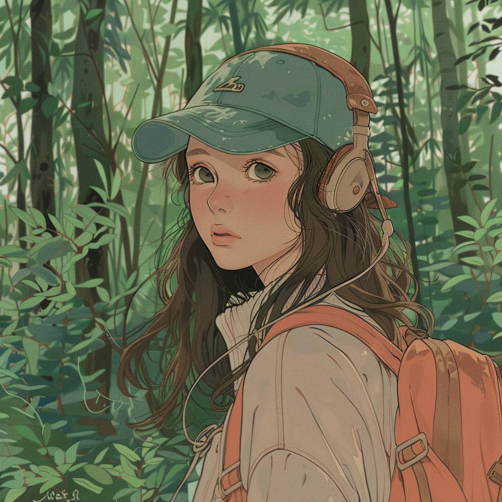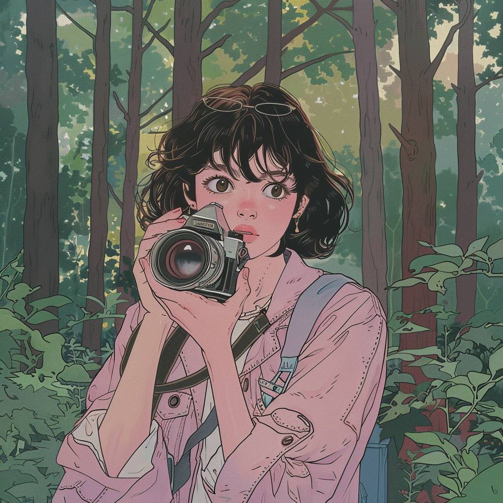 1980s anime, [a photographer capturing wildlife in a lush fores], retro fashion, muted pastel colors, cozy atmosphere, detailed facial features --v 6.0
